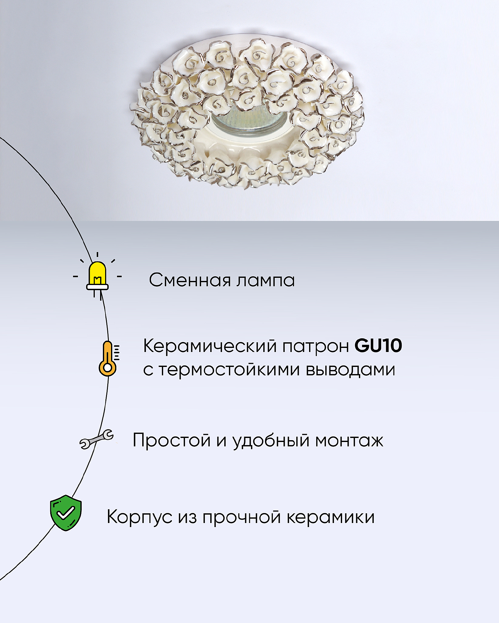 Допускается отличие страны-изготовителя, указанной в характеристиках. Линии производства могут находиться в нескольких государствах. Это не влияет на качество изготовления товара: все заводы данного бренда работают по общим стандартам, а готовые изделия проходят соответствующий контроль.Германия ЦветЦвет арматуры Белый, Серебро Цвет Белый Материал арматуры Керамика РазмерыВысота (мм) 20 Диаметр (мм) 140 Ширина (мм) 140 Высота врезного отверствия (мм) 35 Диаметр врезного отверстия (мм) 70 ЭлектрикаКоличество ламп (шт) 1 Цоколь GU10 Тип лампы Светодиодная, Накаливания Мощность лампы (Вт) 40 Напряжение (В) 220 Площадь освещения 3 Дополнительная информацияСтепень защиты (IP) IP20 Место установки на потолок -