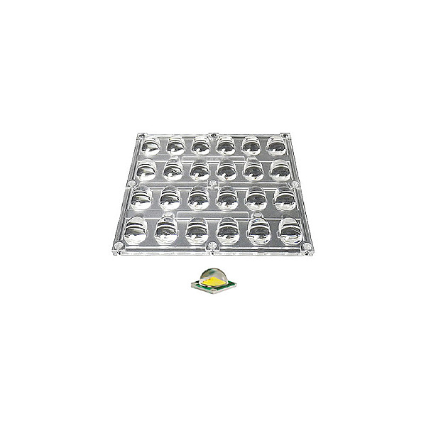 Блочная линза для мощных Emitter, угол обзора: вертикальный 135градусов, горизонтальный 60градусов, прозрачная линза. Материал PMMA, количество светодиодов на плате: 24. Длина 120 мм, ширина 120 мм, высота 10.2 мм.