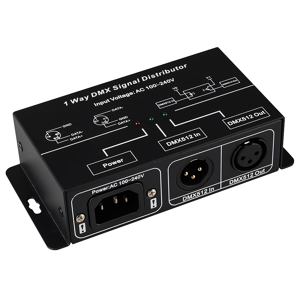 Для усиления входного DMX-сигнала с оптической изоляцией входа от выхода (>1000V) и возможностью дальнейшего каскадирования выхода DMX на 32 устройства. Размер 144,5х72,5х38 мм