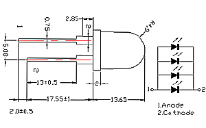 Выводной круглый мощный светодиод, d=10 мм, прозрачная линза. Цвет свечения зеленый (515-525 нм), 4 кристалла. Угол излучения 20градусов. Световой поток 14-18 лм при If=80 мА. VF=3-3.6 В.