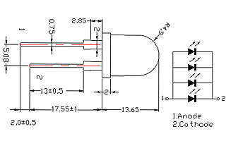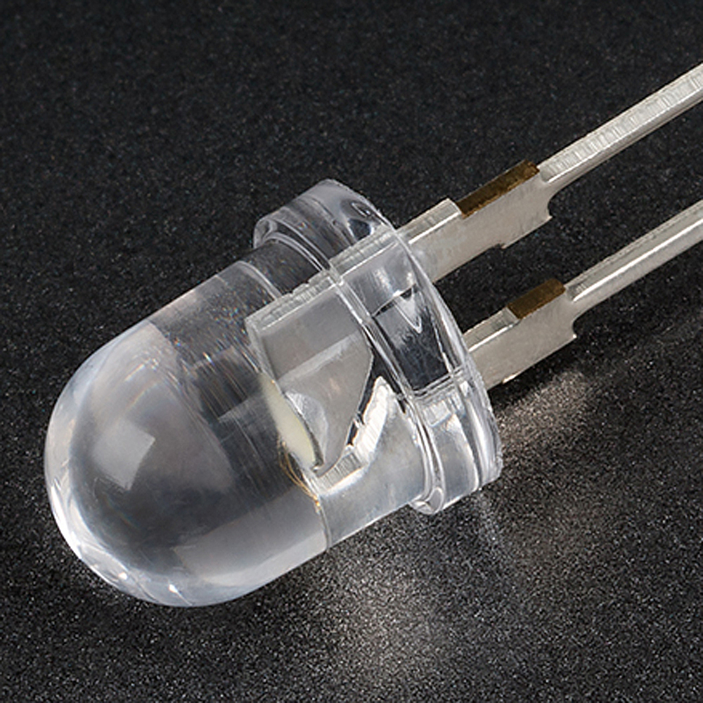 Выводной круглый мощный светодиод, d=10 мм, прозрачная линза. Цвет свечения желтый (585-595 нм), 4 кристалла. Угол излучения 20градусов. Световой поток 2-3.5 лм при If=80 мА. VF=2-2.6 В.