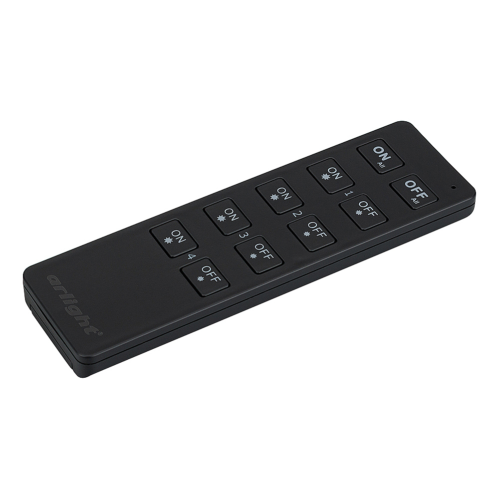 Кнопочный радиопульт 2.4 ГГц черного цвета для управления одноцветным (DIM) источником света. 4 зоны управления, управление яркостью с помощью кнопок. Питание 3VDC (CR2032). Габариты 135x40x11 мм. Изготовлен из пластика с покрытием Soft Touch. Управляет контроллерами и панелями серии SMART (поставляются отдельно). Настенные держатели приобретаются отдельно (см. аксессуары).