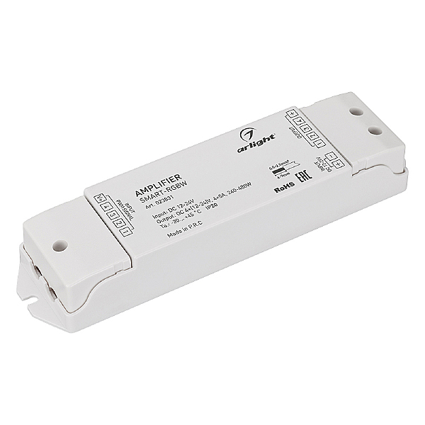 RGBW-усилитель. Питание 12-24VDC. 4 канала, ток нагрузки 4x5A, мощность нагрузки 240-480W. Размер 175x45x27 мм.