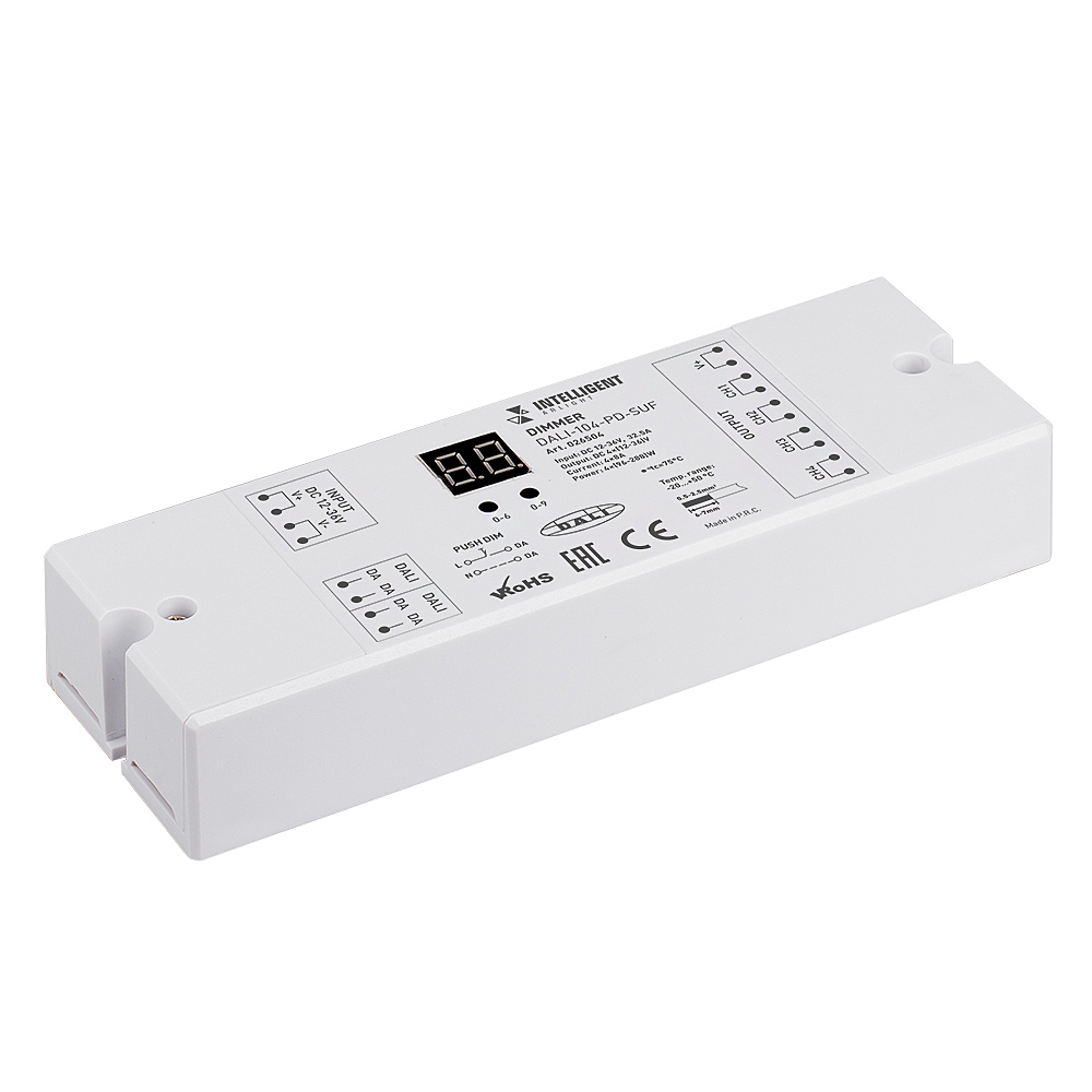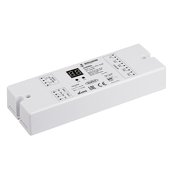 Мощный DALI диммер на 4 адреса, для одноцветных или RGBW светодиодных лент, 4 асинхронных канала. Управляется сигналом DALI или кнопками PUSH DIM. Питание\выход 12-36 VDC. Высокая частота ШИМ 1500Гц. Макс.ток 4x8A. Размеры 168x58x28 мм.