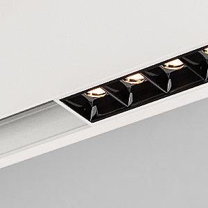 Светильник для магнитных треков шириной 45мм, 6Вт. Цвет свечения ДНЕВНОЙ 4000K, световой поток 455лм, угол 15градусов, CRI>90. Корпус прямоугольный, металл, цвет белый, IP20. Размеры LxWxH 163x35x43мм. Входное напряжение DC24V, мощность 6Вт. Драйвер DС24V/AC230V поставляется отдельно. Диммируется только с 026407(1), 027633.