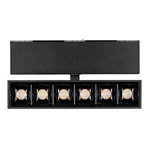 Светильник поворотный для магнитных треков шириной 45мм, 6Вт. Цвет свечения ДНЕВНОЙ 4000K, световой поток 455лм, угол 15градусов, CRI>90. Корпус прямоугольный, металл, цвет черный, IP20. Размеры LxWxH 163x35x92.5мм. Входное напряжение DC24V, мощность 6Вт. Драйвер DС24V/AC230V поставляется отдельно. Диммируется только с 026407(1), 027633.