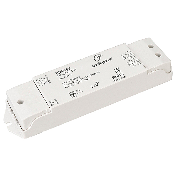Диммер для монохромной светодиодной ленты (ШИМ). Питание/рабочее напряжение 12-24VDC, максимальный ток 15A на канал, 1 канал, максимальная мощность 180-360W. Винтовые клеммы. Корпус - PVC. Габариты 175x45x27 мм. Управляется пультами и панелями серии SMART (поставляются отдельно).
