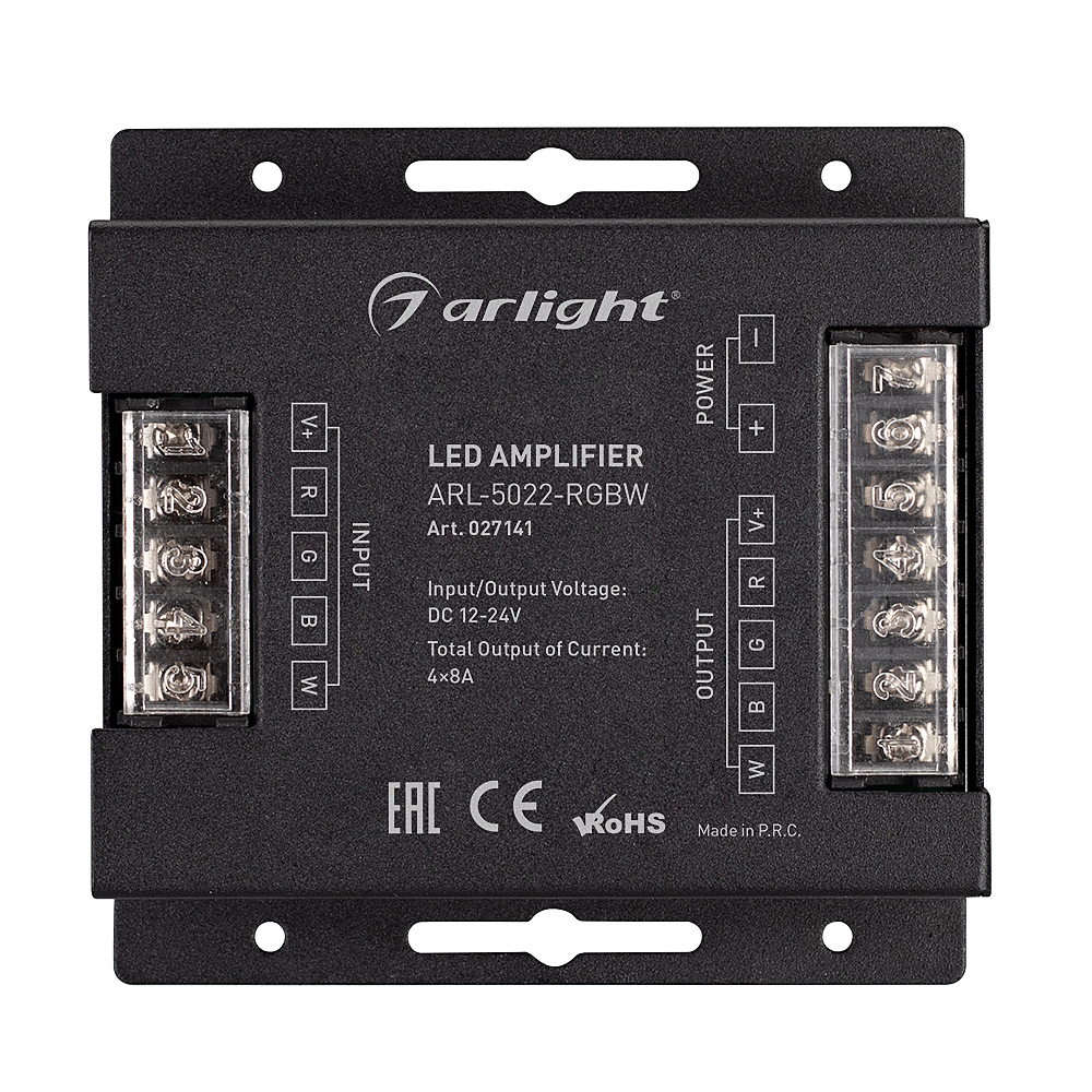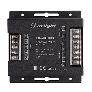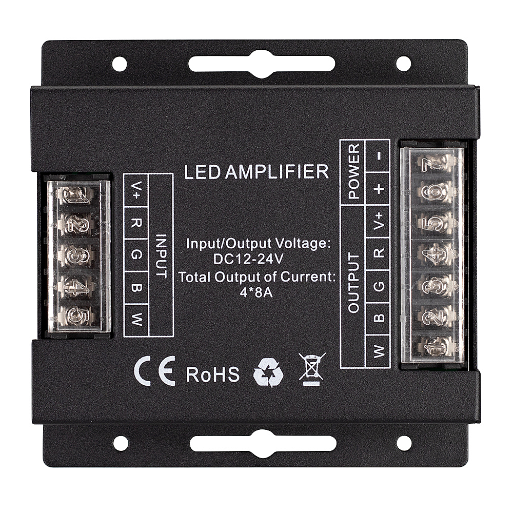 4-х канальный RGBW усилитель для контроллеров (12-24VDC). Питание 12-24VDC. 4 канала, ток нагрузки 4x8A, мощность нагрузки 384-768W. Размер 94x92x26 мм.