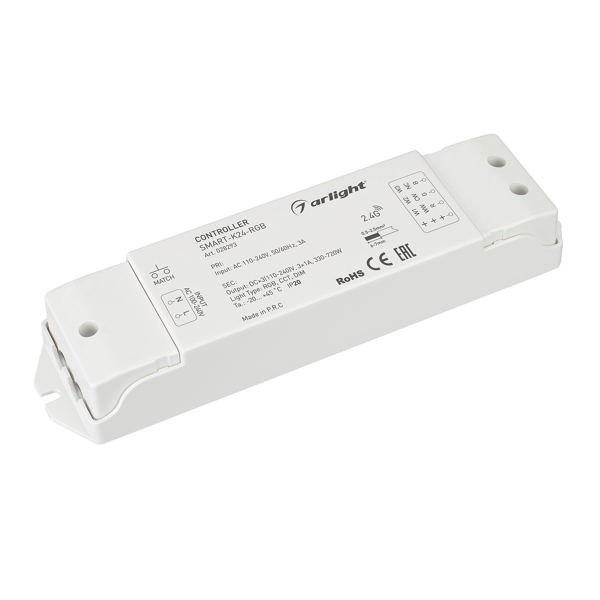 Контроллер для 230V светодиодной ленты (ШИМ). Питание/рабочее напряжение AC 110-240V, максимальный ток 1A на канал, 3 канала, максимальная мощность 330-720W. Винтовые клеммы. Корпус - PVC. Габариты 175х45х27 мм. Управляется пультами и панелями серии SMART (поставляются отдельно).