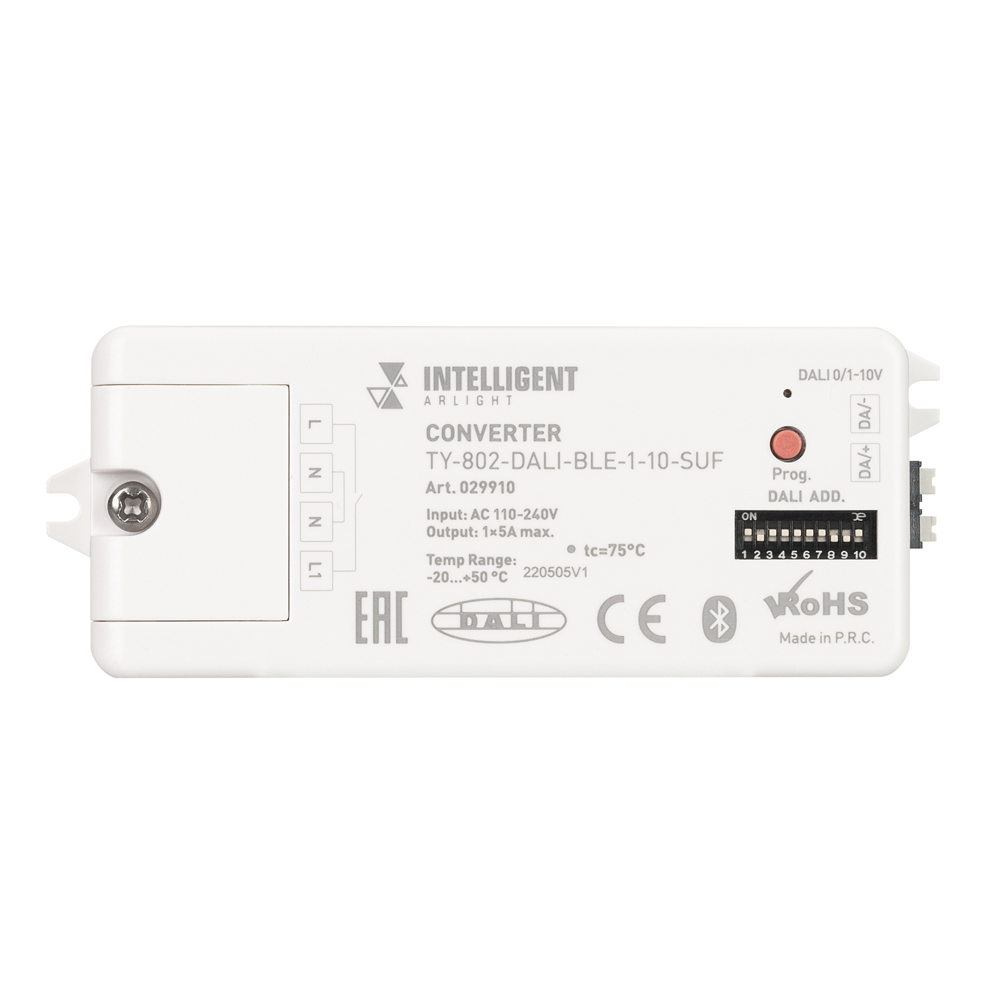 Конвертер BLE(TUYA) в DALI / 0-10V. Входное напряжение 230В. Имеет встроенный источник питания шины DALI. Управлением по Bluetooth Mesh Low Energy v4.2 (SIG Mesh)Режим работы 0-10 / DALI адрес / DALI группы / DALI Broadcast