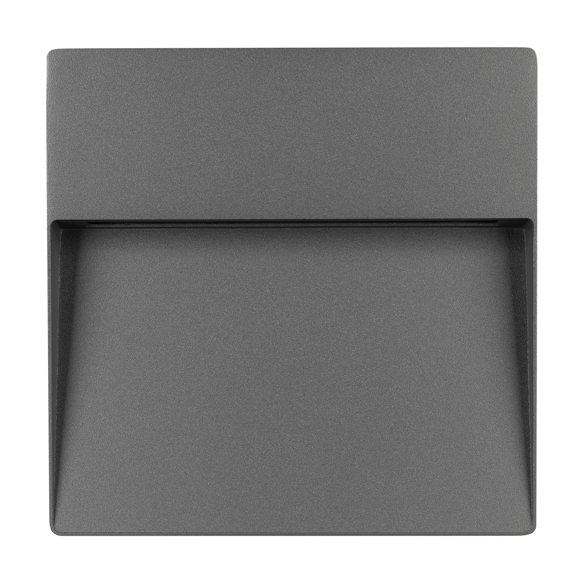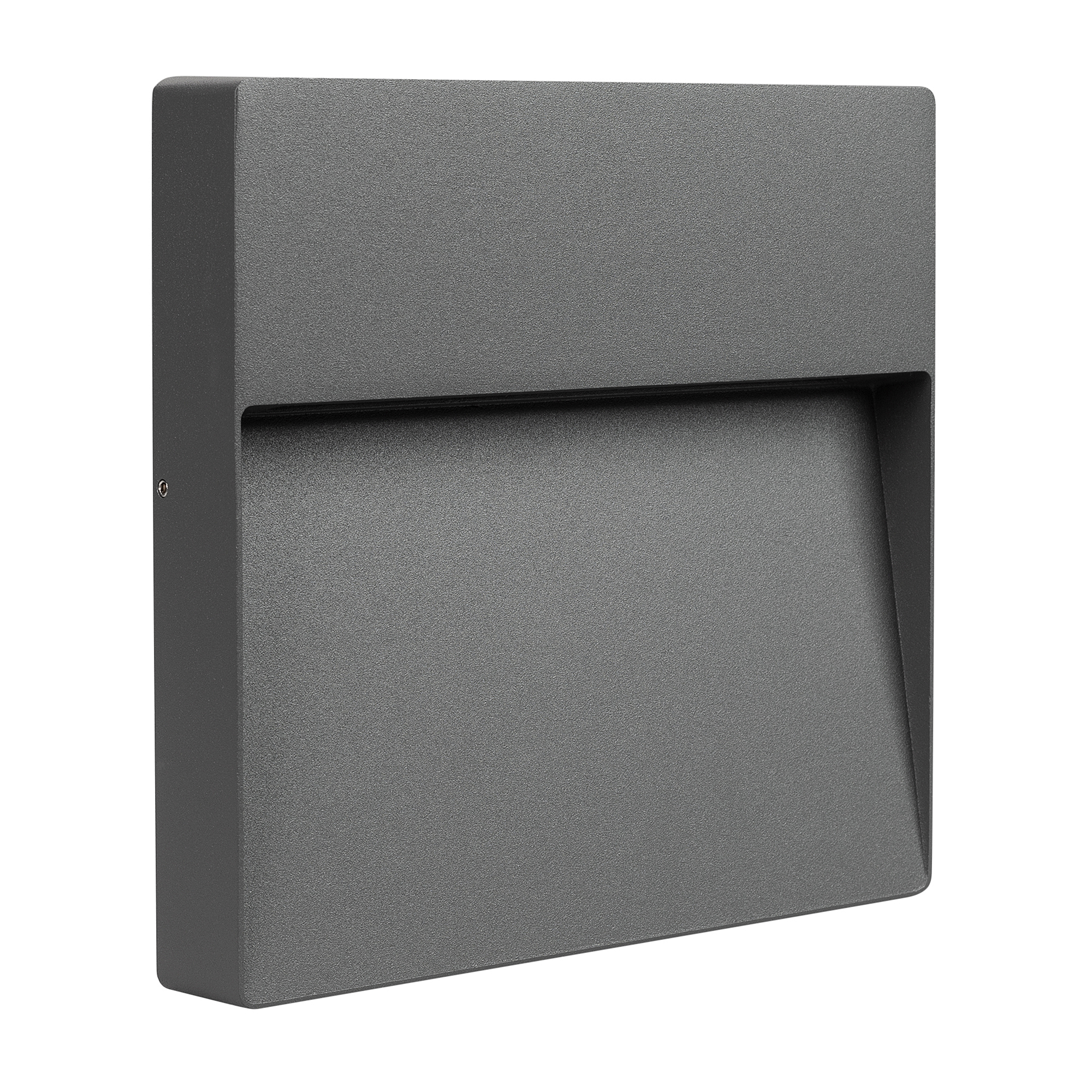 Светодиодный накладной квадратный светильник для стен, лестниц, 8Вт. Цвет ТЕПЛЫЙ БЕЛЫЙ 3000K, св.поток 300лм, CRI(Ra)>80, угол 60градусов, асимметричный свет. Размер 215x215x36мм. Влагозащищенный корпус IP65, алюминий серого цвета. Питание AC230V, 8Вт, встроенный драйвер.