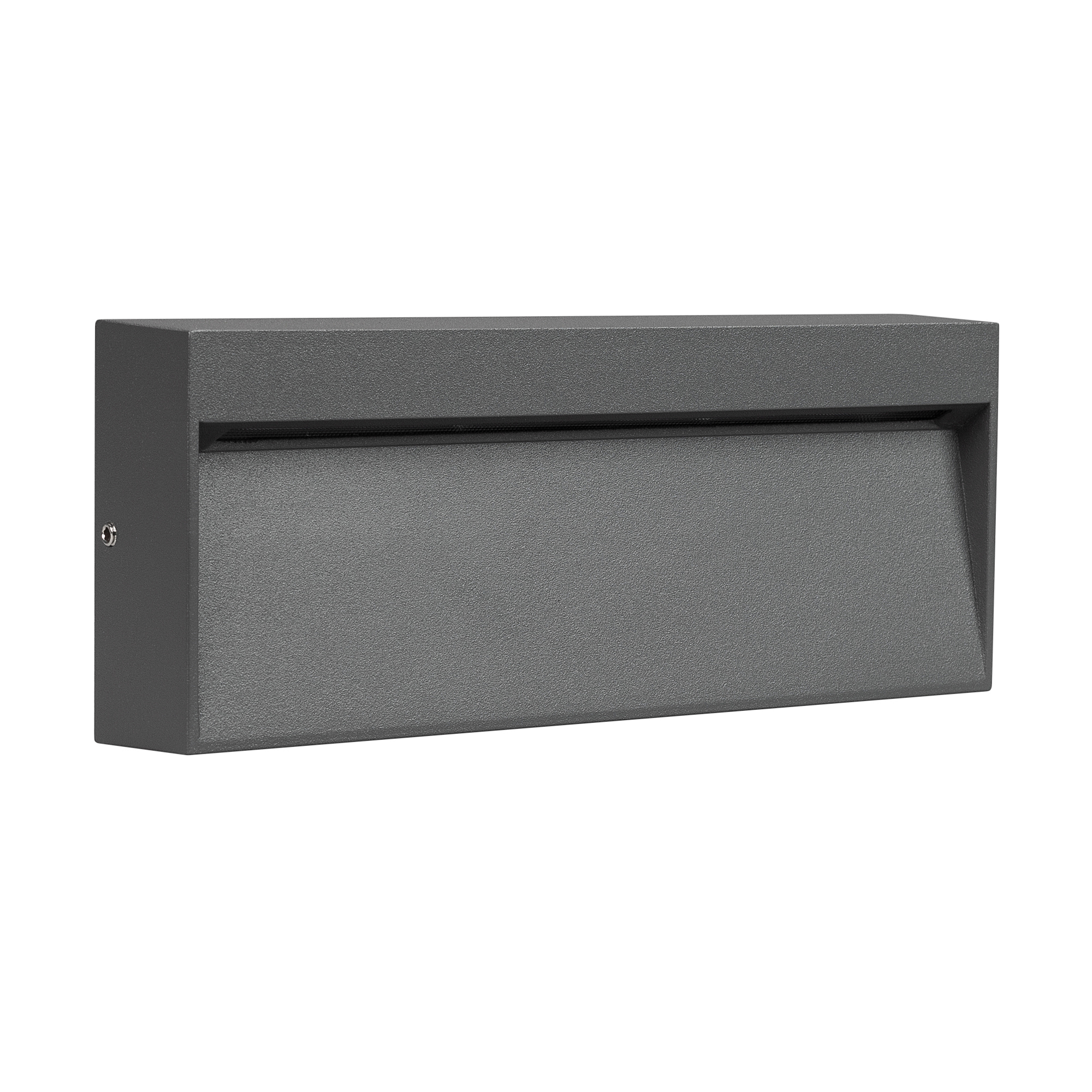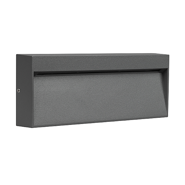 Светодиодный накладной прямоугольный светильник для стен, лестниц, 8Вт. Цвет ТЕПЛЫЙ БЕЛЫЙ 3000K, св.поток 300лм, CRI(Ra)>80, угол 65градусов, асимметричный свет. Размер 200x80x32мм. Влагозащищенный корпус IP65, алюминий серого цвета. Питание AC230V, 8Вт, встроенный драйвер.