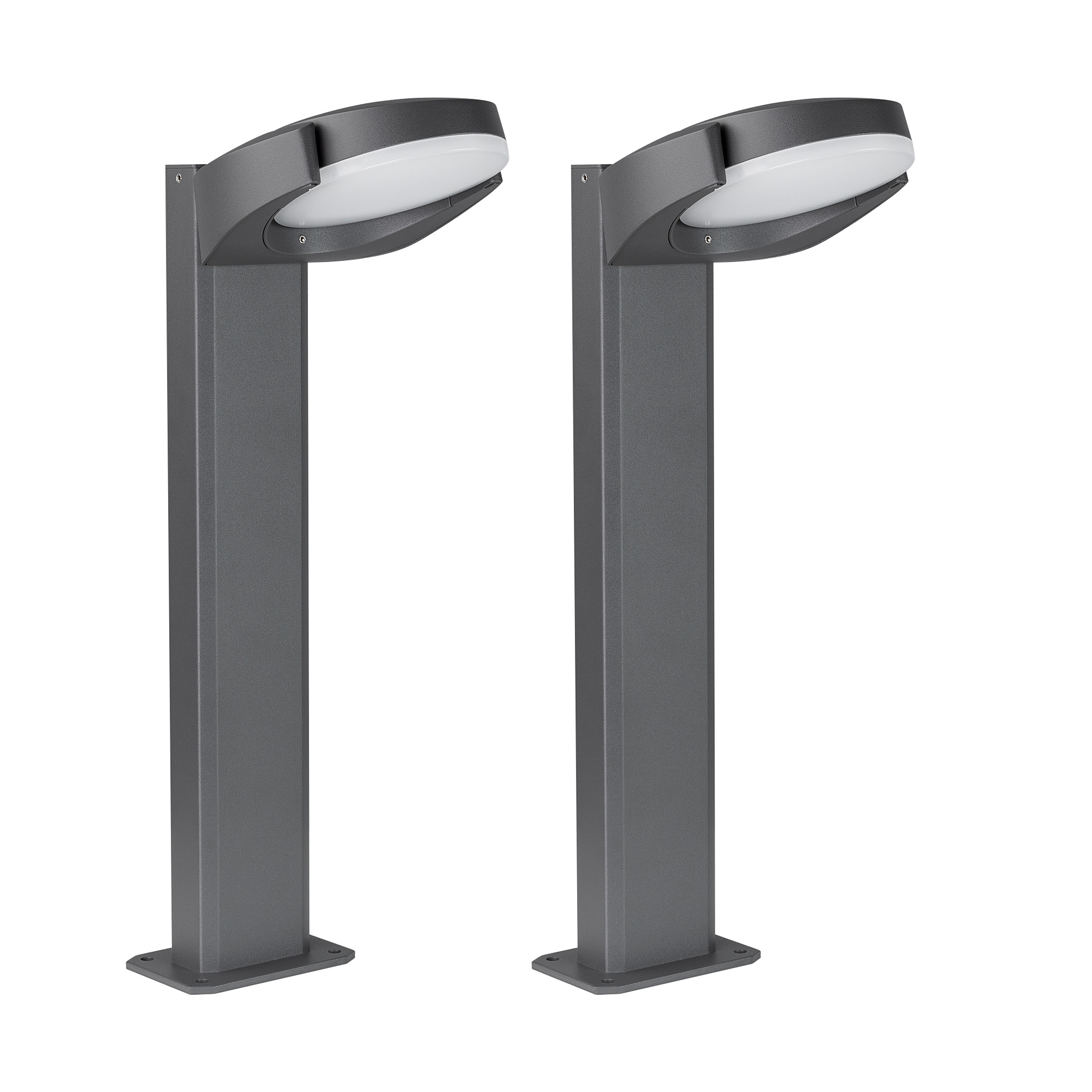 КОМПЛЕКТ ИЗ ДВУХ СВЕТИЛЬНИКОВ. 500мм уличный светодиодный светильник с поворотной оптической частью (угол поворота 40градусов) для подсветки дорожек. Цвет ТЕПЛЫЙ БЕЛЫЙ 3000К, 6Вт (615лм). Влагозащищенный корпус IP54 - серый алюминий, экран из поликарбоната. Питание 230В, мощность 6Вт. Размеры ДхШхВ 248х151х500 мм.