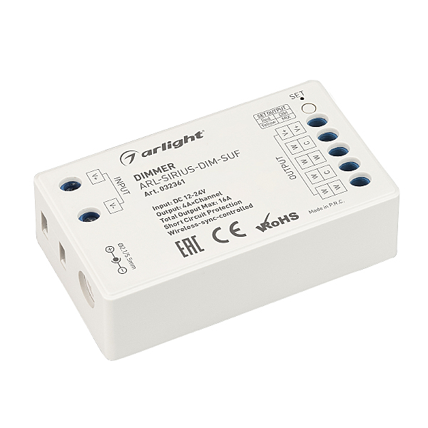 Контроллер для светодиодной DIM/MIX/RGB/RGBW ленты (ШИМ). Питание/рабочее напряжение 12-24VDC, максимальный ток 4A на канал, 4 канала, максимальная мощность 192-384W. Винтовые клеммы. Корпус - PVC. Габариты 70х40х20 мм. Список совместимых пультов в разделе "Совместимые".