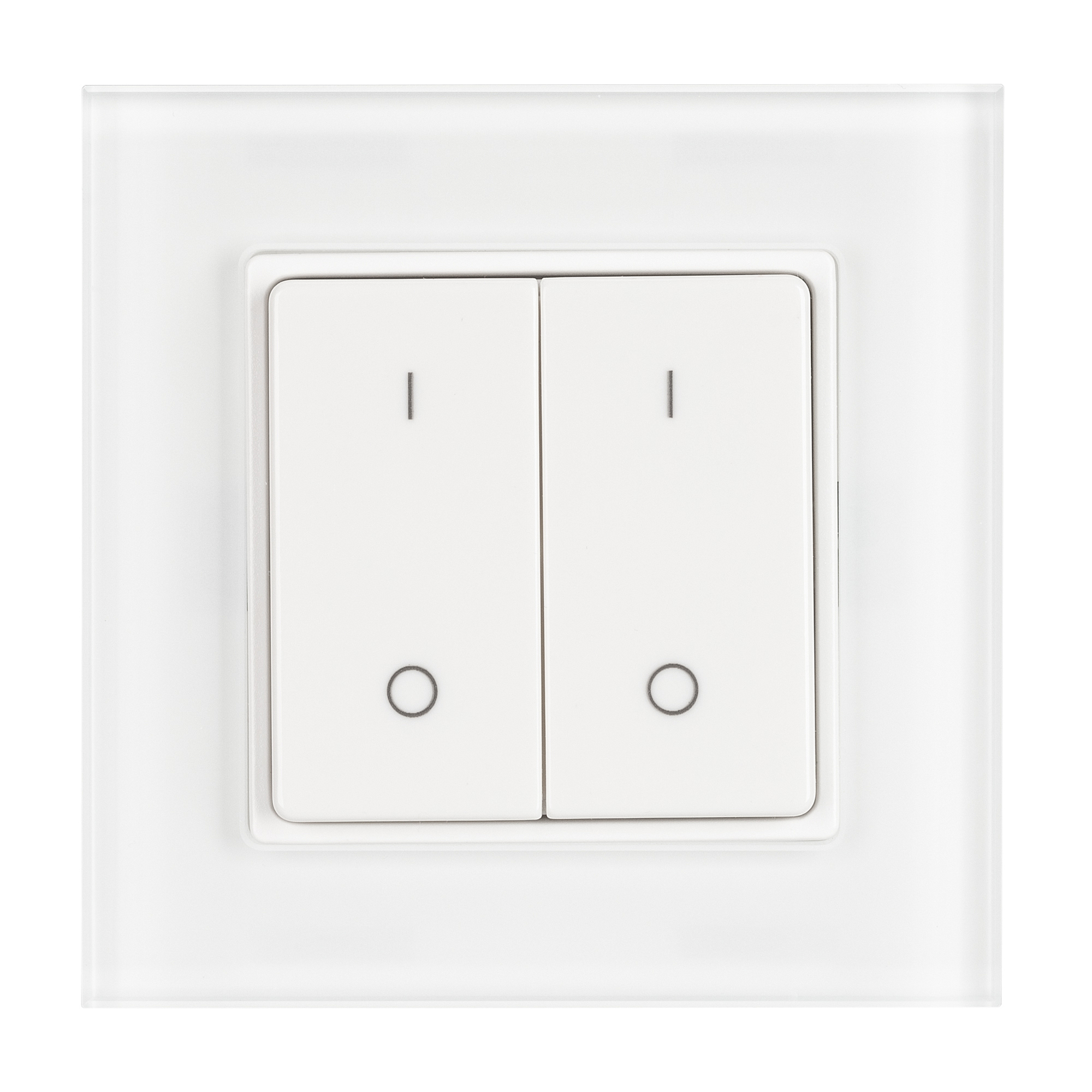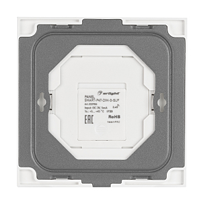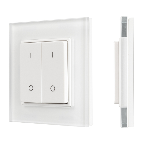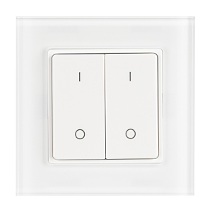 Накладная кнопочная панель 2.4 ГГц, цвет белый. Материал - стекло. Для управления одноцветными источниками света, 2 зоны управления. Питание/рабочее напряжение 3 VDC от батарейки CR2032. Габариты 86х86х15 мм. Совместима с диммерами SMART.