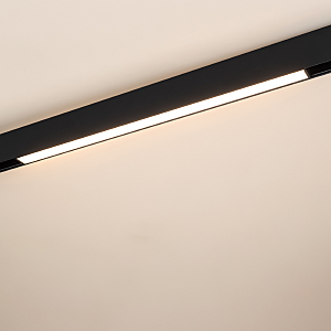 Светильник для магнитных треков MAG-ORIENT шириной 26 мм. Мощность 16 Вт, св. поток 780 лм, 48 лм/Вт, теплый 3000 K, CRI>90, угол 80°, напряжение питания 48 В. Черный прямоугольный корпус из металл, экран поликарбонат, степень защиты IP20. Размер: длина 462 мм, ширина 22 мм, высота 42 мм. Монтаж на трек MAG-ORIENT. Пульсация <1%.