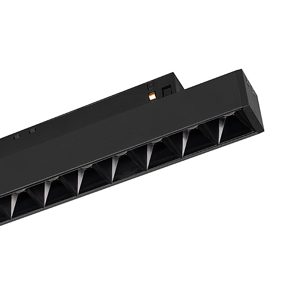 Светильник для магнитных треков MAG-ORIENT шириной 26 мм. Мощность 8 Вт, св. поток 440 лм, 55 лм/Вт, теплый 3000 K, CRI>90, угол24градусов, напряжение питания 48 В. Черный прямоугольный корпус из металл, экран поликарбонат, степень защиты IP20. Размер: длина 235 мм, ширина 22 мм, высота 42 мм. Монтаж на трек MAG-ORIENT. Пульсация <1%.