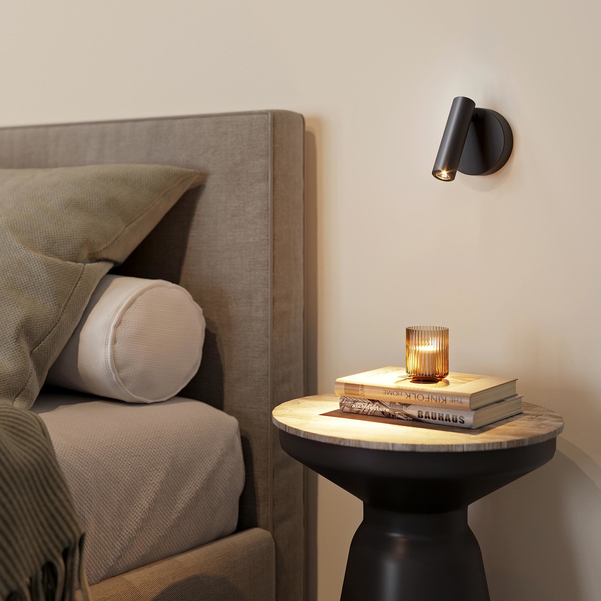 Накладной настенный светильник 3Вт, черный алюминиевый корпус без кнопки включения. Цвет ТЕПЛЫЙ БЕЛЫЙ 3000K, св.поток 200лм, CRI(Ra)>80, угол 20градусов.Размер Основание Ф90x31мм, Светоизлучатель Ø30×110 мм.. IP20. Питание AC220-240V, 3Вт, встроенный драйвер.