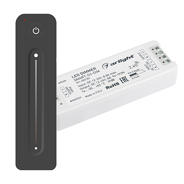 Комплект диммера с пультом для одноцветной светодиодной ленты (ШИМ). Питание/рабочее напряжение 12-24VDC, максимальный ток 8A на канал, 1 канал, максимальная мощность 96-192W. Габариты диммера 97x33x18 мм, габариты пульта 139x36x11 мм.
