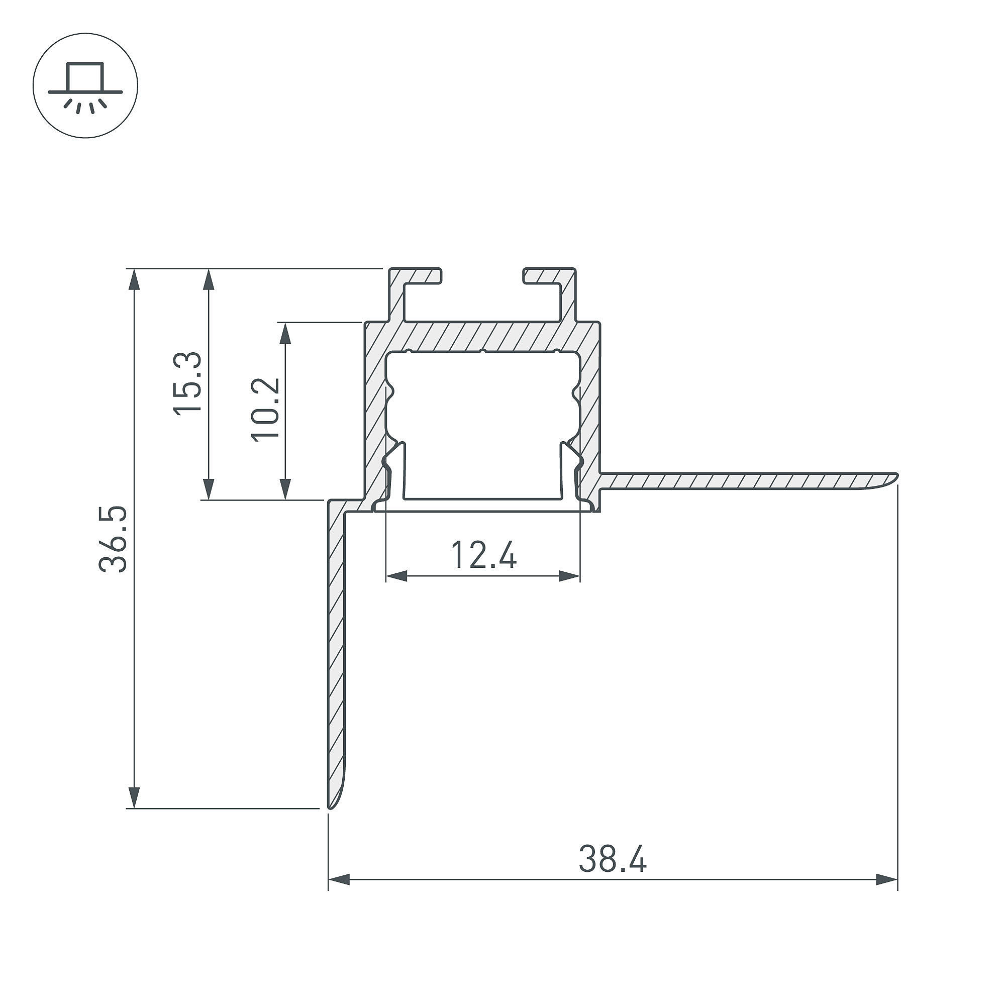 Алюминиевый анодированный встраиваемый профиль для светодиодных лент и линеек. Габаритные размеры (L×W×H): 2000х38,4х36,5 мм. Ширина площадки для ленты 12,4 мм. Экраны, заглушки и другие аксессуары приобретаются отдельно. Цена за 1 метр.