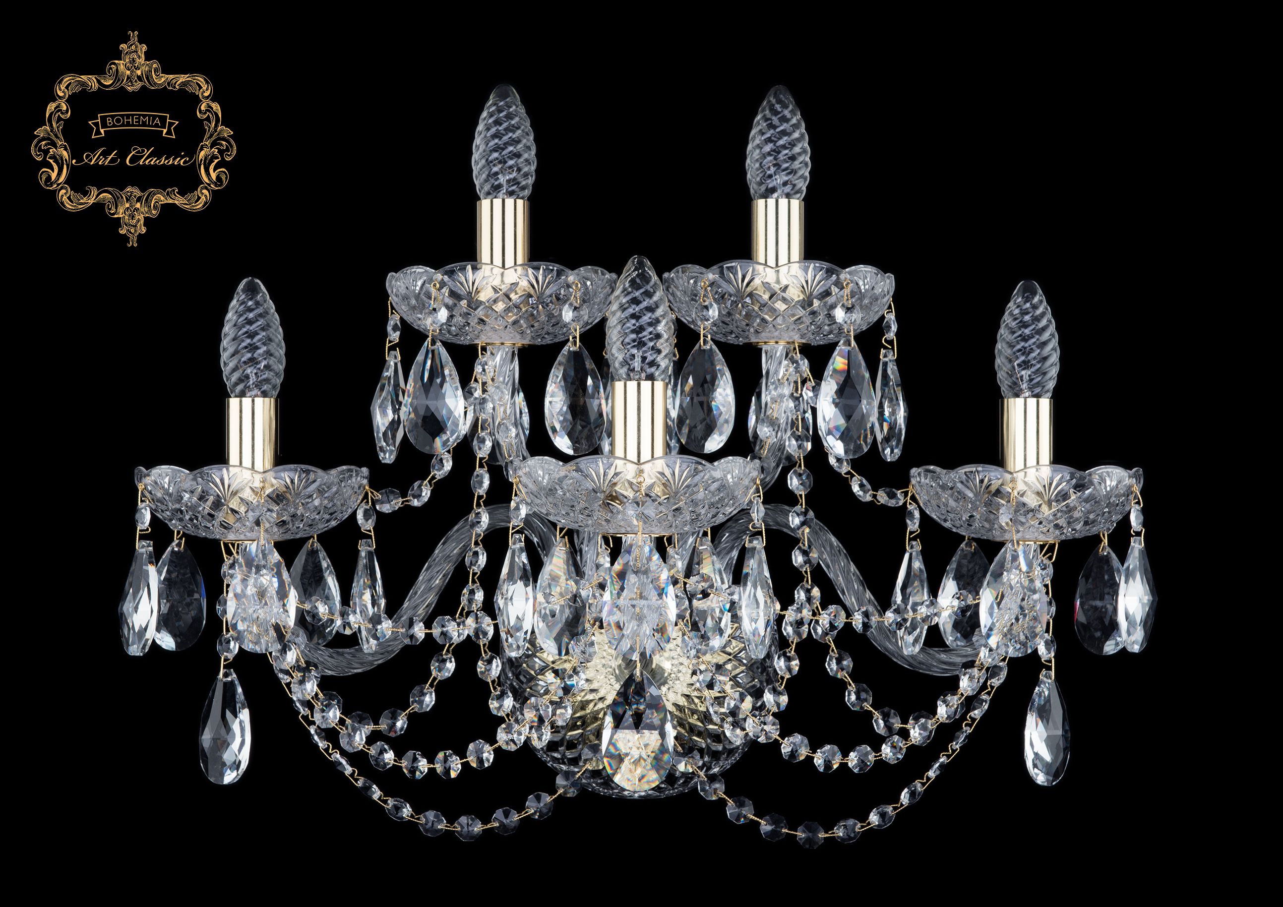 Допускается отличие страны-изготовителя, указанной в характеристиках. Линии производства могут находиться в нескольких государствах. Это не влияет на качество изготовления товара: все заводы данного бренда работают по общим стандартам, а готовые изделия проходят соответствующий контроль.Чехия Коллекция 11.11 ЦветЦвет арматуры Золото Цвет Прозрачный Материал арматуры Металл Цвет декора бесцветный Материал декора Хрусталь РазмерыВысота (мм) 360 Ширина (мм) 540 Глубина (мм) 300 ЭлектрикаКоличество ламп (шт) 5 Цоколь E14 Тип лампы Накаливания Мощность лампы (Вт) 40 Напряжение (В) 220 Площадь освещения 11 Дополнительная информацияСтепень защиты (IP) IP20 Вес (Кг) 4 -