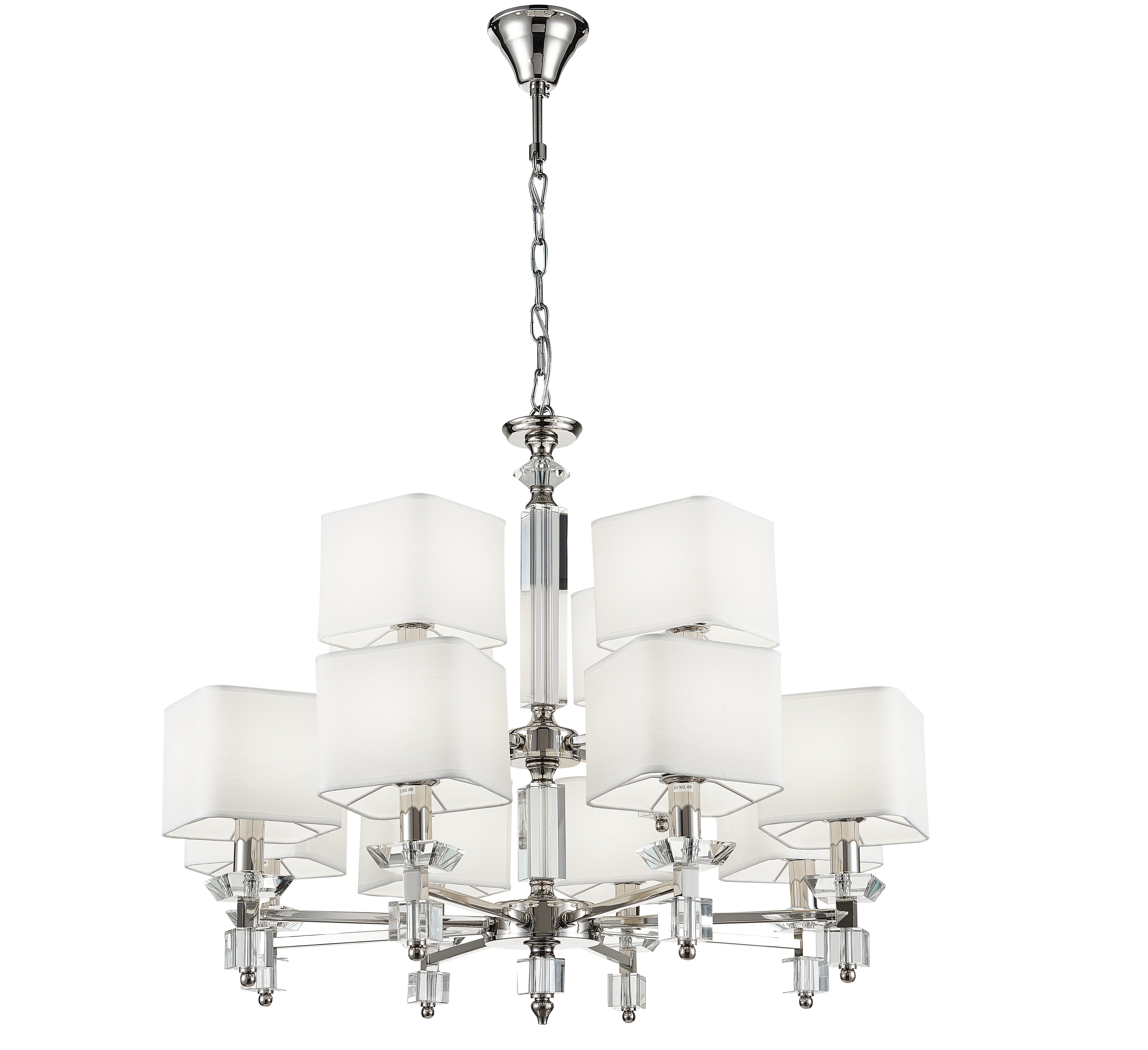 Допускается отличие страны-изготовителя, указанной в характеристиках. Линии производства могут находиться в нескольких государствах. Это не влияет на качество изготовления товара: все заводы данного бренда работают по общим стандартам, а готовые изделия проходят соответствующий контроль.Россия Коллекция 1013 ЦветЦвет арматуры глянцевый никель Цвет Никель Материал арматуры Металл Цвет плафона Белый Материал декора Стекло Материал плафона Текстиль на ПВХ РазмерыВысота (мм) 1660 Диаметр (мм) 900 Высота минимальная (мм) 900 Ширина (мм) 900 Диаметр абажура-плафона 150 Высота абажура-плафона 130 ЭлектрикаКоличество ламп (шт) 12 Цоколь E14 Мощность лампы (Вт) 40 Напряжение (В) 220 Дополнительная информацияСпособ крепления Крюк Степень защиты (IP) IP20 Вес (Кг) 11,3 Тип подвеса На цепи -