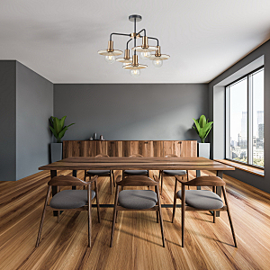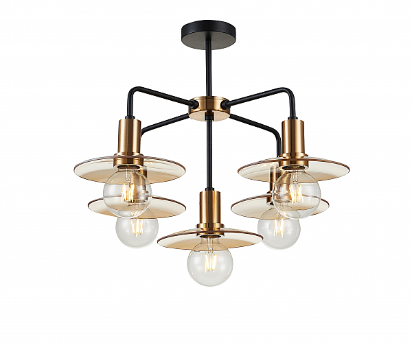 Люстра из металла цвета бронзы, черной потолочной чашей и проводом, декоративное стекло теплого янтарного оттенка. 5хЕ27