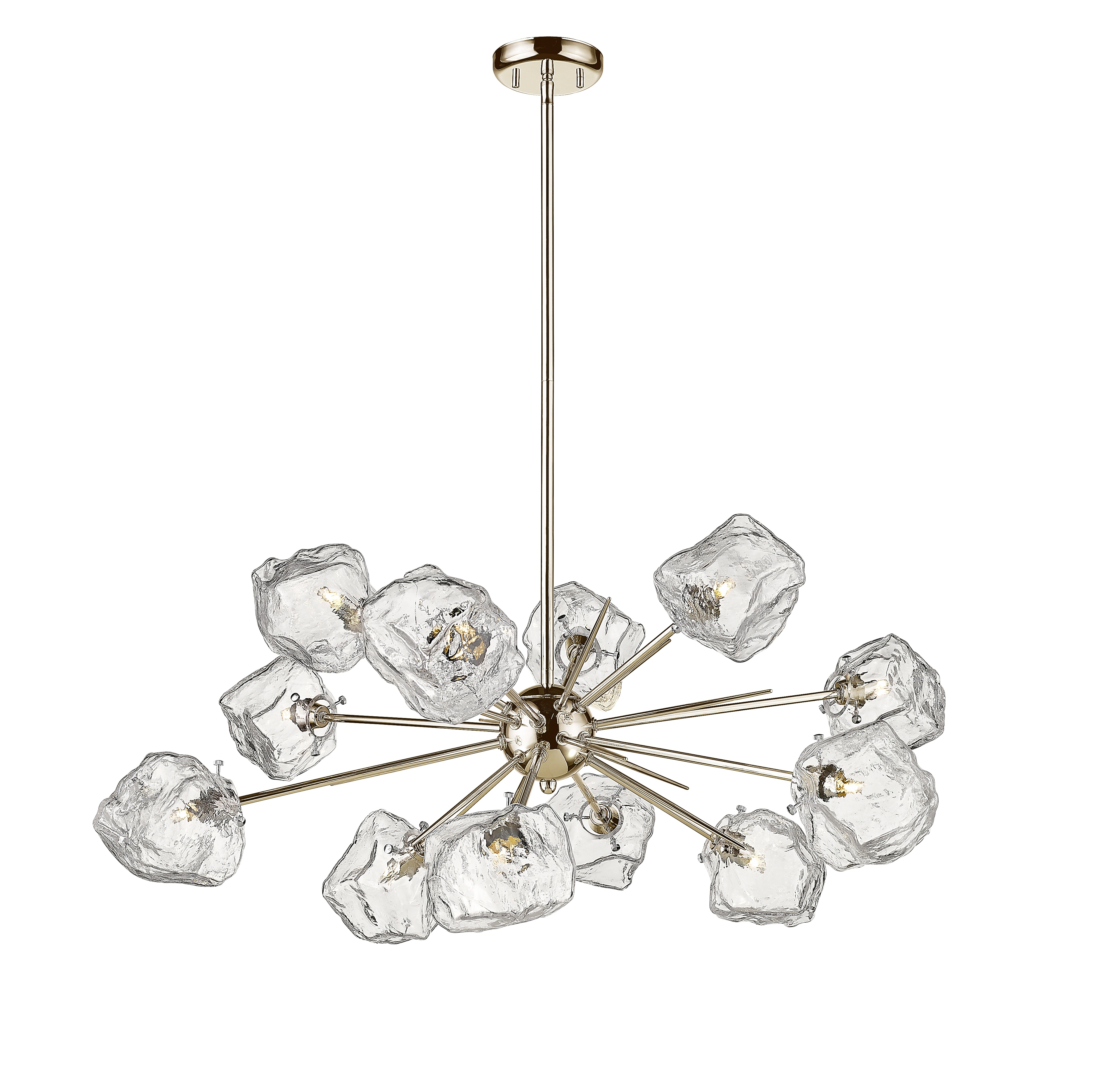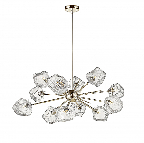 Люстра из металла цвета матовое золото и стеклянными плафонами напоминающими прозрачные глыбы льда. 12хG9