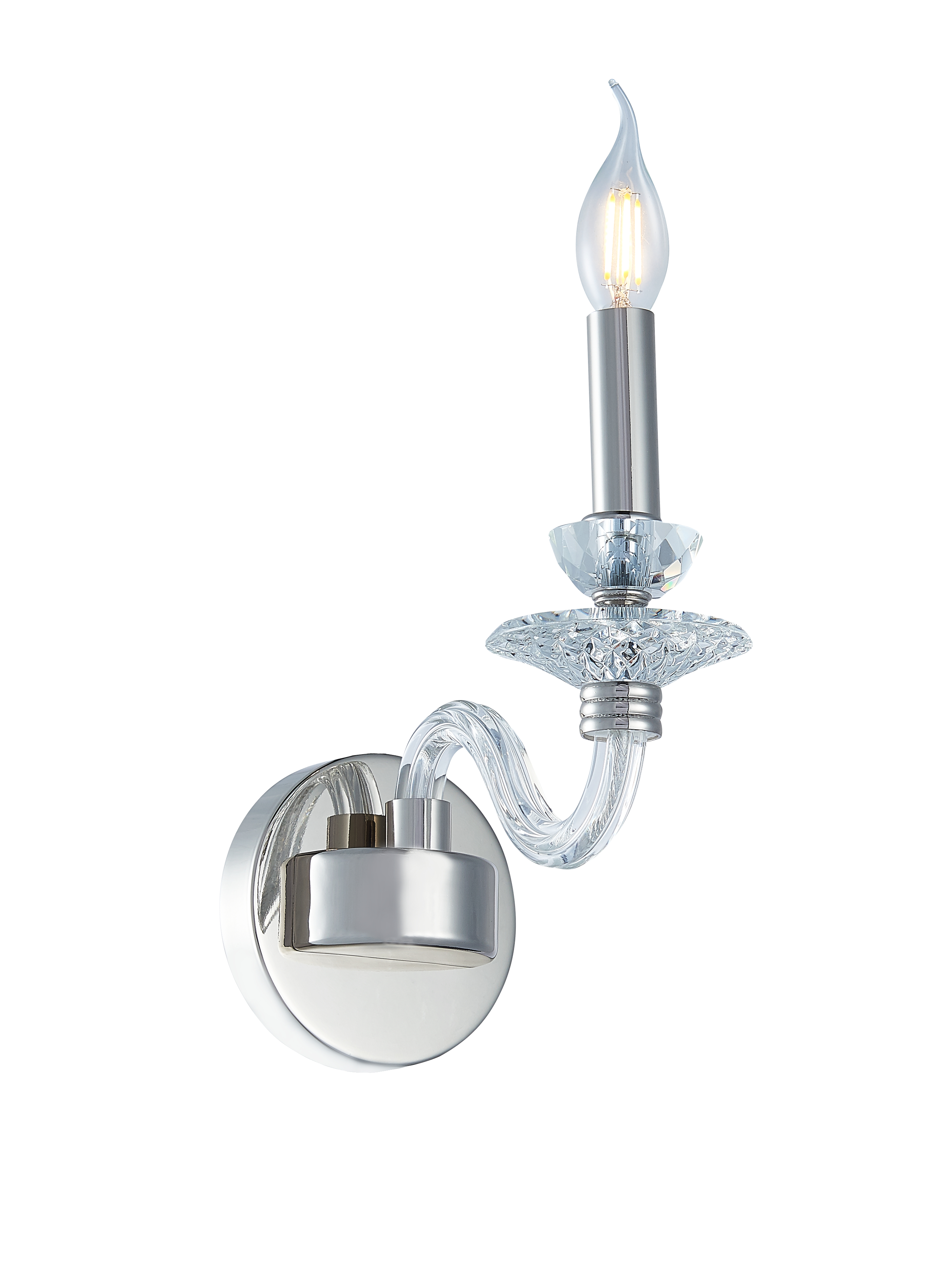 Бра из металла цвета глянцевый никель со стеклянным рожком и декоративным элементом. 1хЕ14