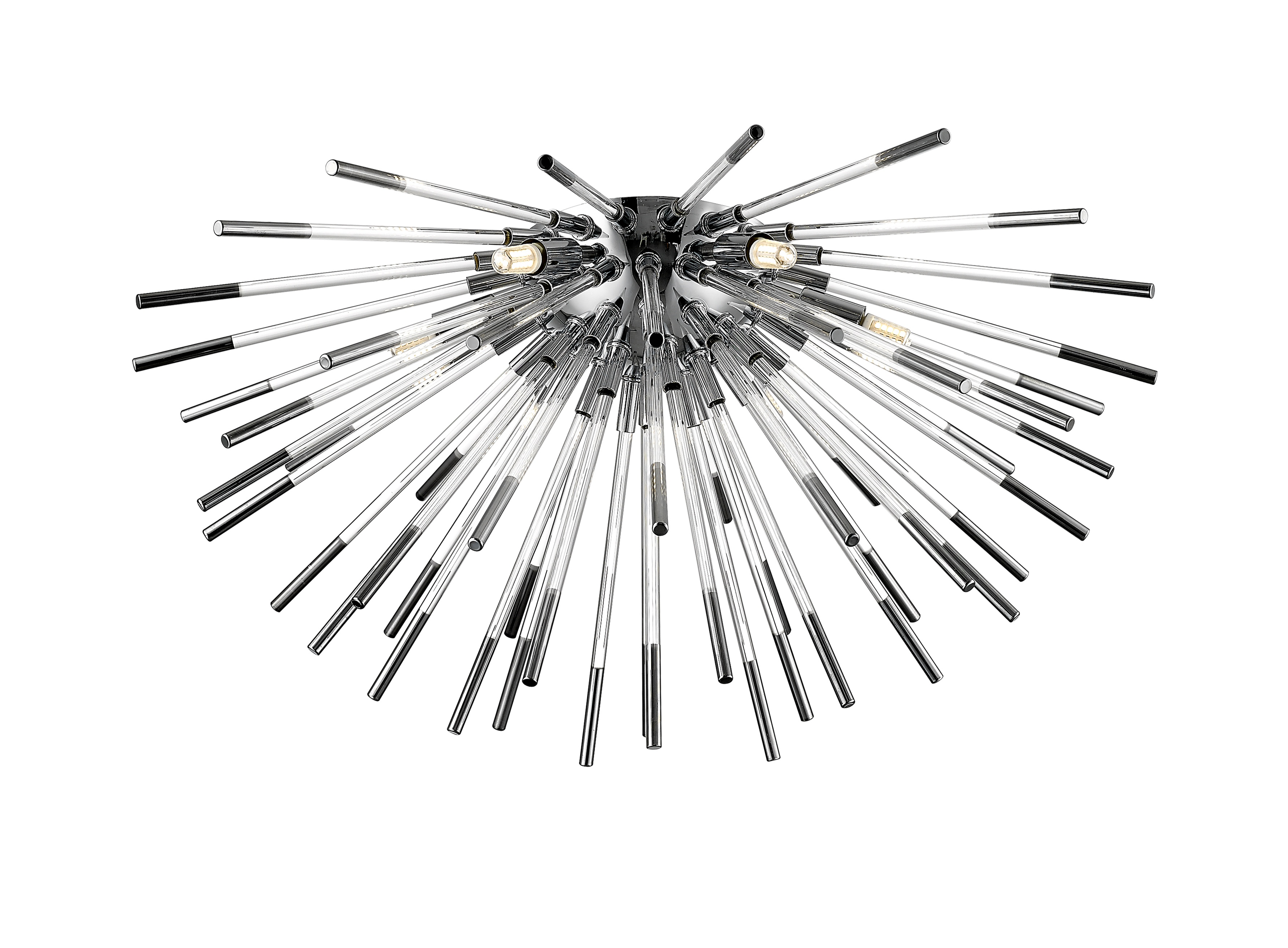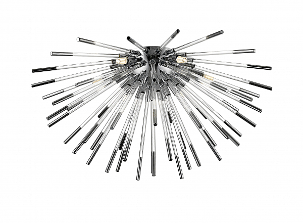 Потолочный светильник из металла цвета хром и стеклянных трубочек с хромовыми наконечниками. D640mm, H330mm, 6хG9