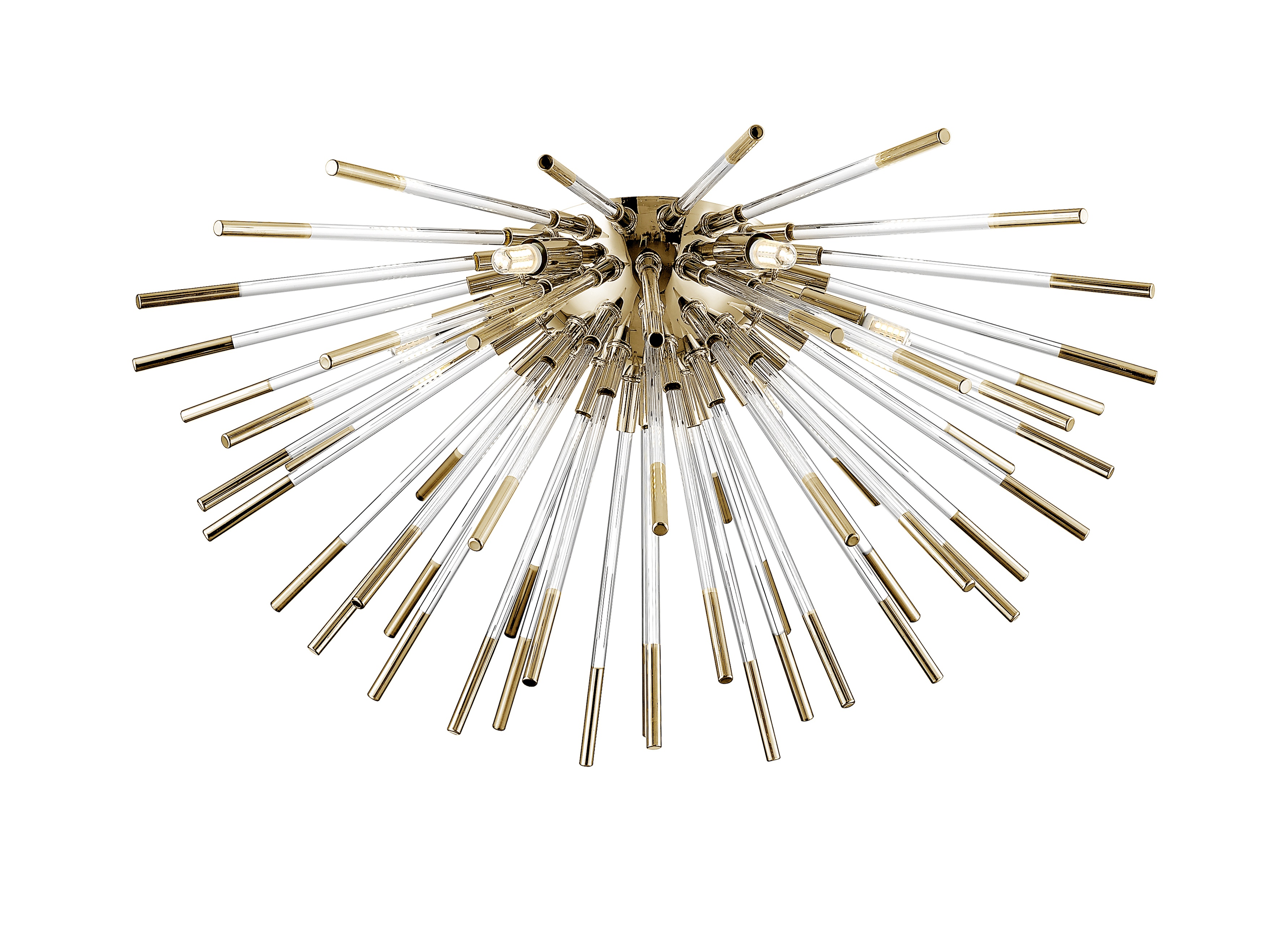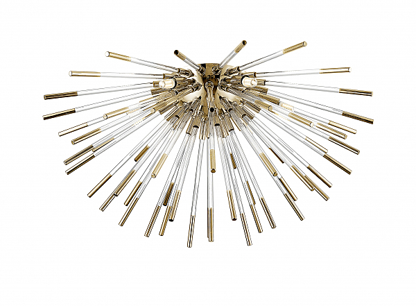 Потолочный светильник из металла цвета золота и стеклянных трубочек с наконечниками золотого цвета. D640mm, H330mm, 6хG9