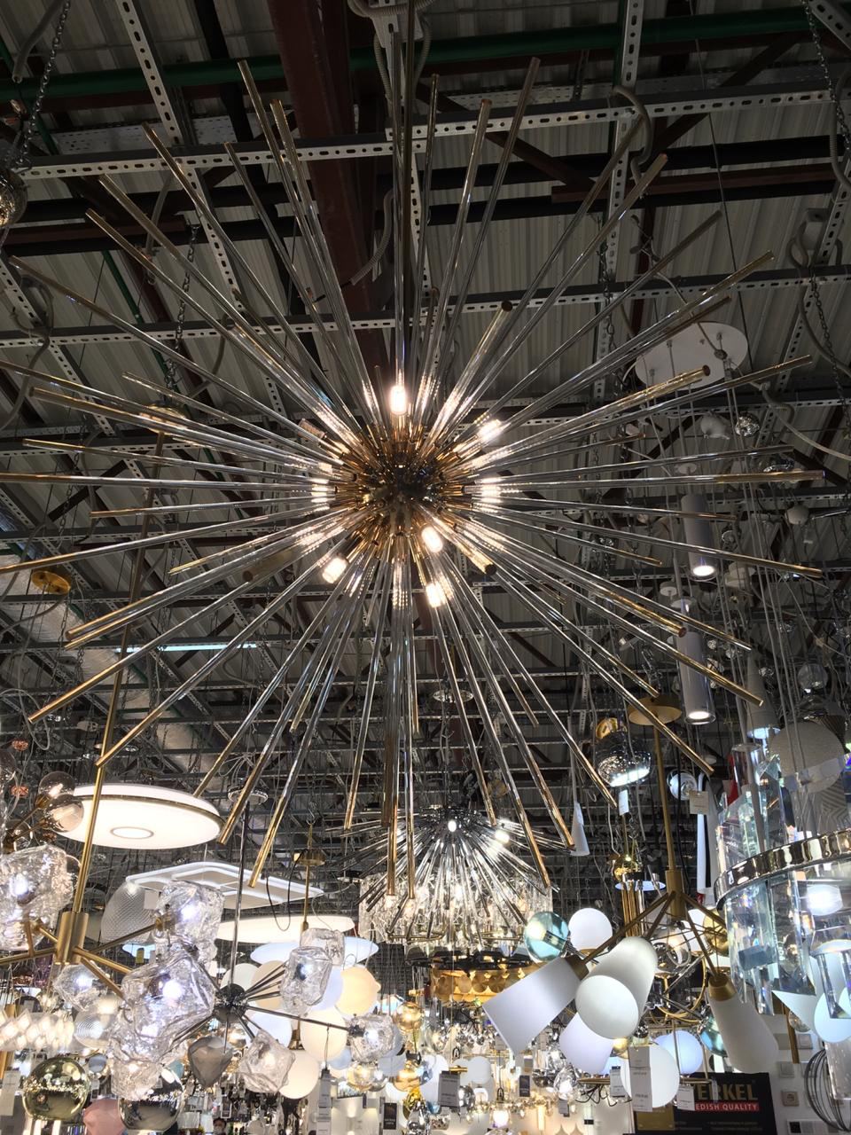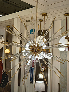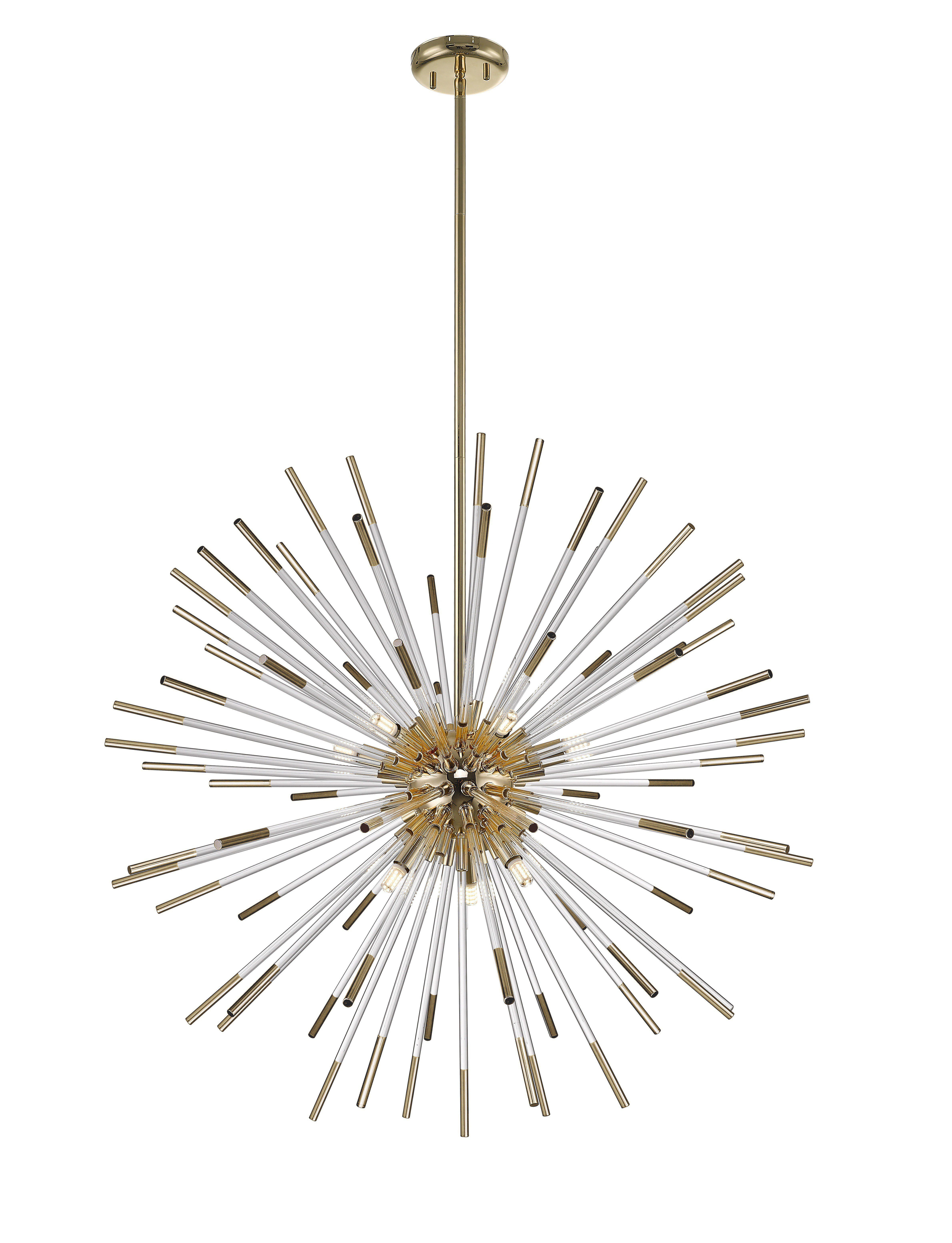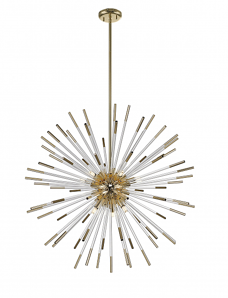 Подвесной светильник из металла цвета золота и стеклянных трубочек с наконечниками золотого цвета. D780mm, H830-1600mm, 9хG9