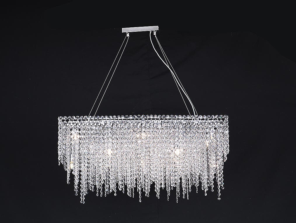 Допускается отличие страны-изготовителя, указанной в характеристиках. Линии производства могут находиться в нескольких государствах. Это не влияет на качество изготовления товара: все заводы данного бренда работают по общим стандартам, а готовые изделия проходят соответствующий контроль.США Коллекция 10900 ЦветЦвет арматуры Хром Цвет Хром Материал арматуры Железо Цвет декора прозрачный Материал декора Хрусталь РазмерыВысота (мм) 1500 Длина (мм) 880 Высота минимальная (мм) 500 Ширина (мм) 400 ЭлектрикаКоличество ламп (шт) 18 Цоколь G9 Мощность лампы (Вт) 60 Дополнительная информацияТип подвеса На тросах -