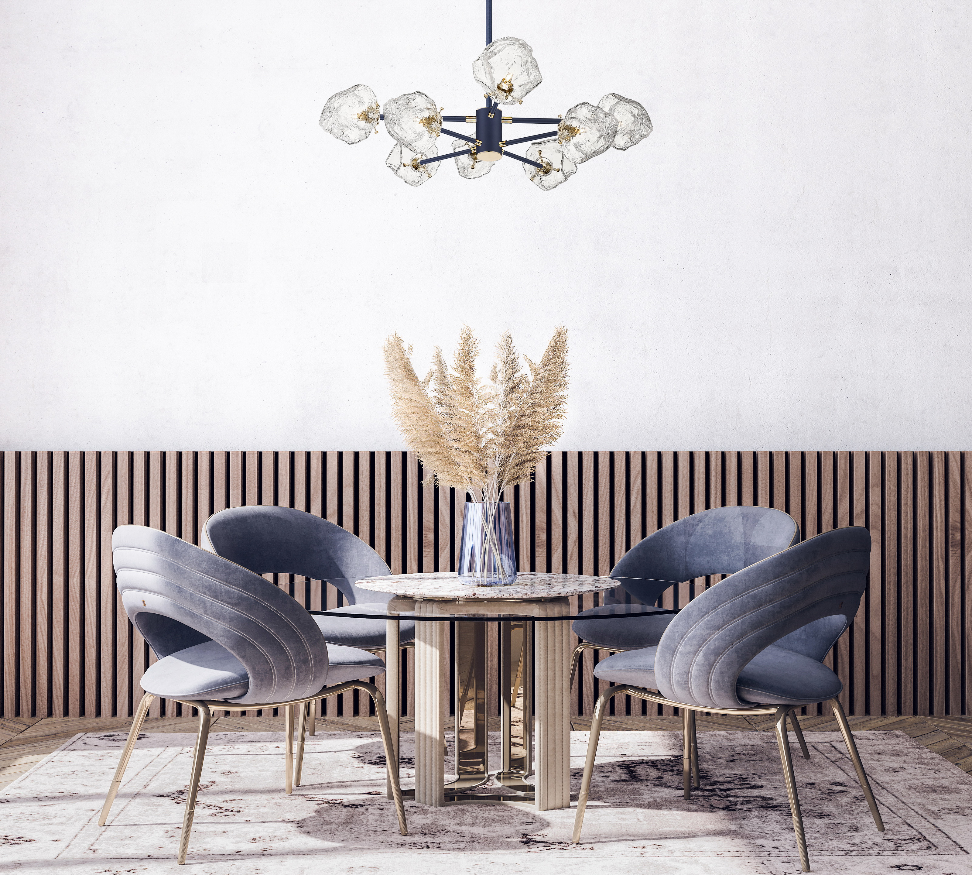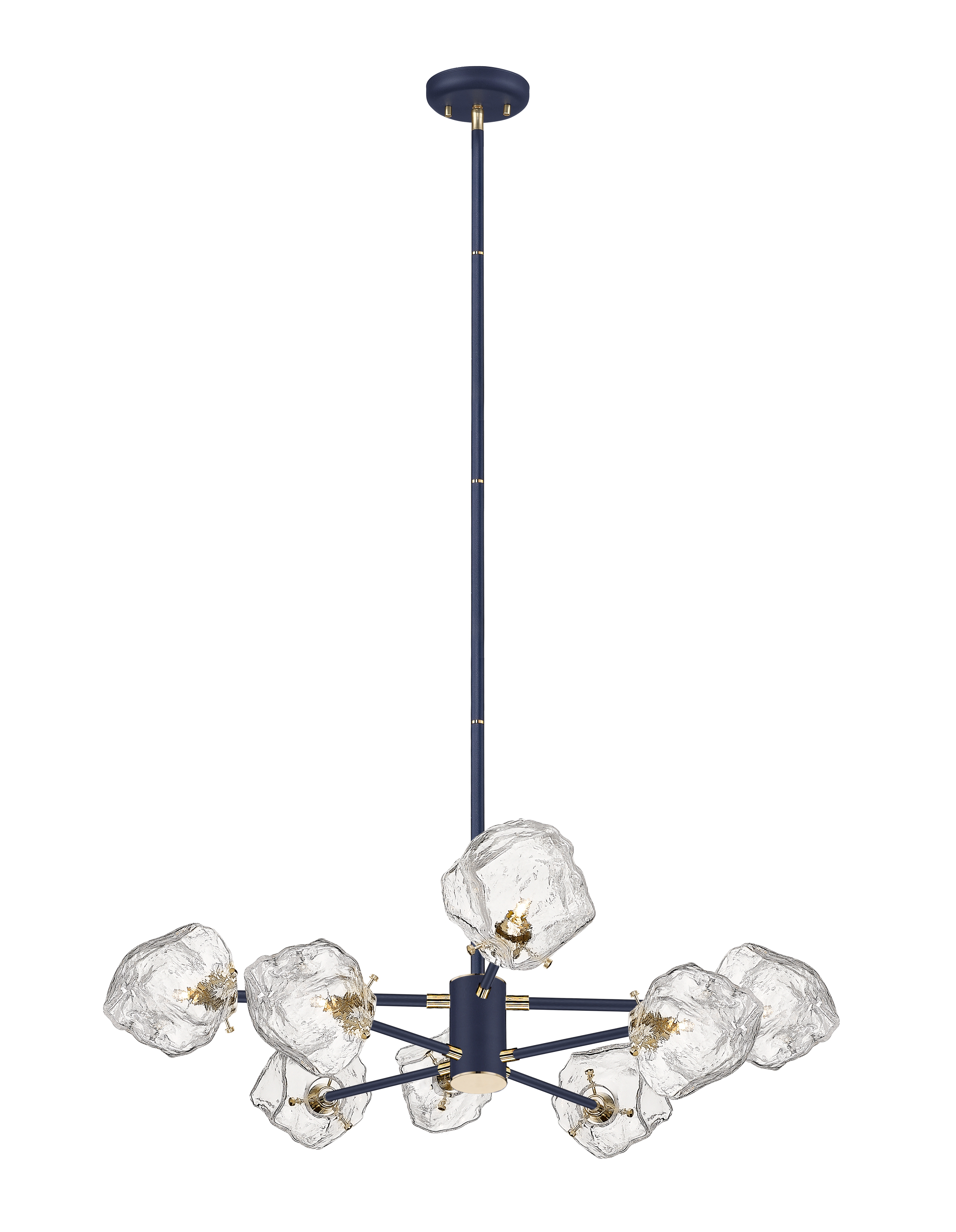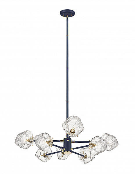 Люстра из металла окрашенного в матовый синий цвет с золотыми элементами и плафонами в виде прозрачных глыб льда. D920mm, H470-1390mm, 8хG9