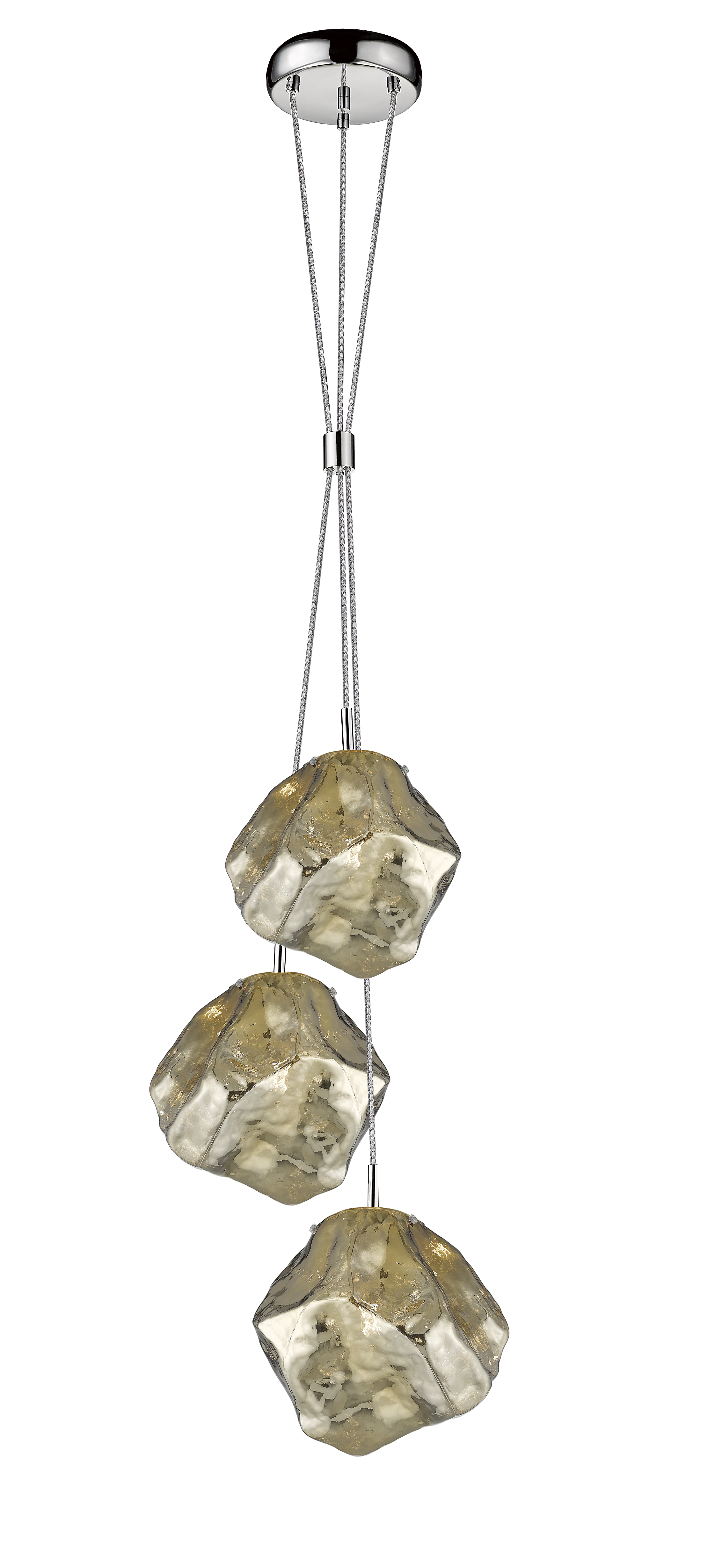 Подвес из металла цвета хром, с прозрачными проводами и тремя стеклянными плафонами с золотым гальванизированным напылением. D430mm, H1200-1830mm, 3хE27