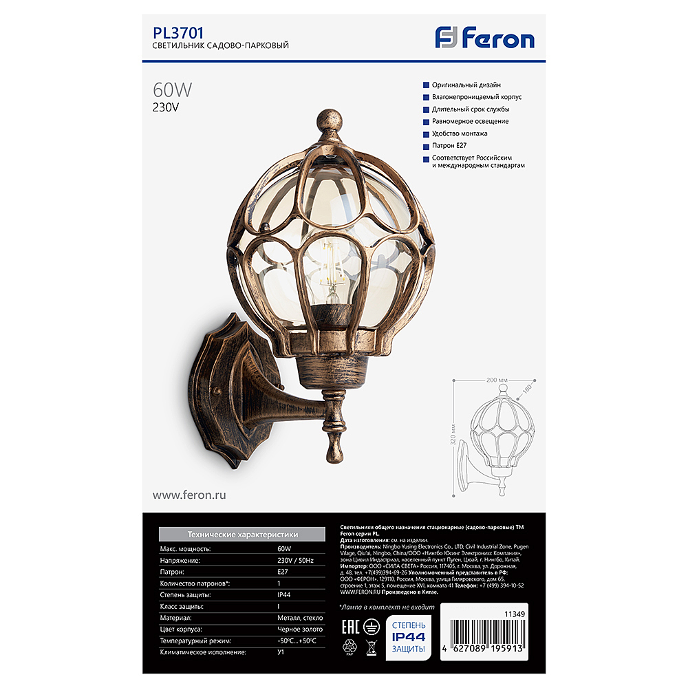 Допускается отличие страны-изготовителя, указанной в характеристиках. Линии производства могут находиться в нескольких государствах. Это не влияет на качество изготовления товара: все заводы данного бренда работают по общим стандартам, а готовые изделия проходят соответствующий контроль.Китай Коллекция PL3701 ЦветЦвет арматуры Черное золото Цвет Черный Материал арматуры Металл, Стекло РазмерыВысота (мм) 320 Ширина (мм) 180 ЭлектрикаКоличество ламп (шт) 1 Цоколь E27 Напряжение (В) 220 Дополнительная информацияСтепень защиты (IP) IP44 -