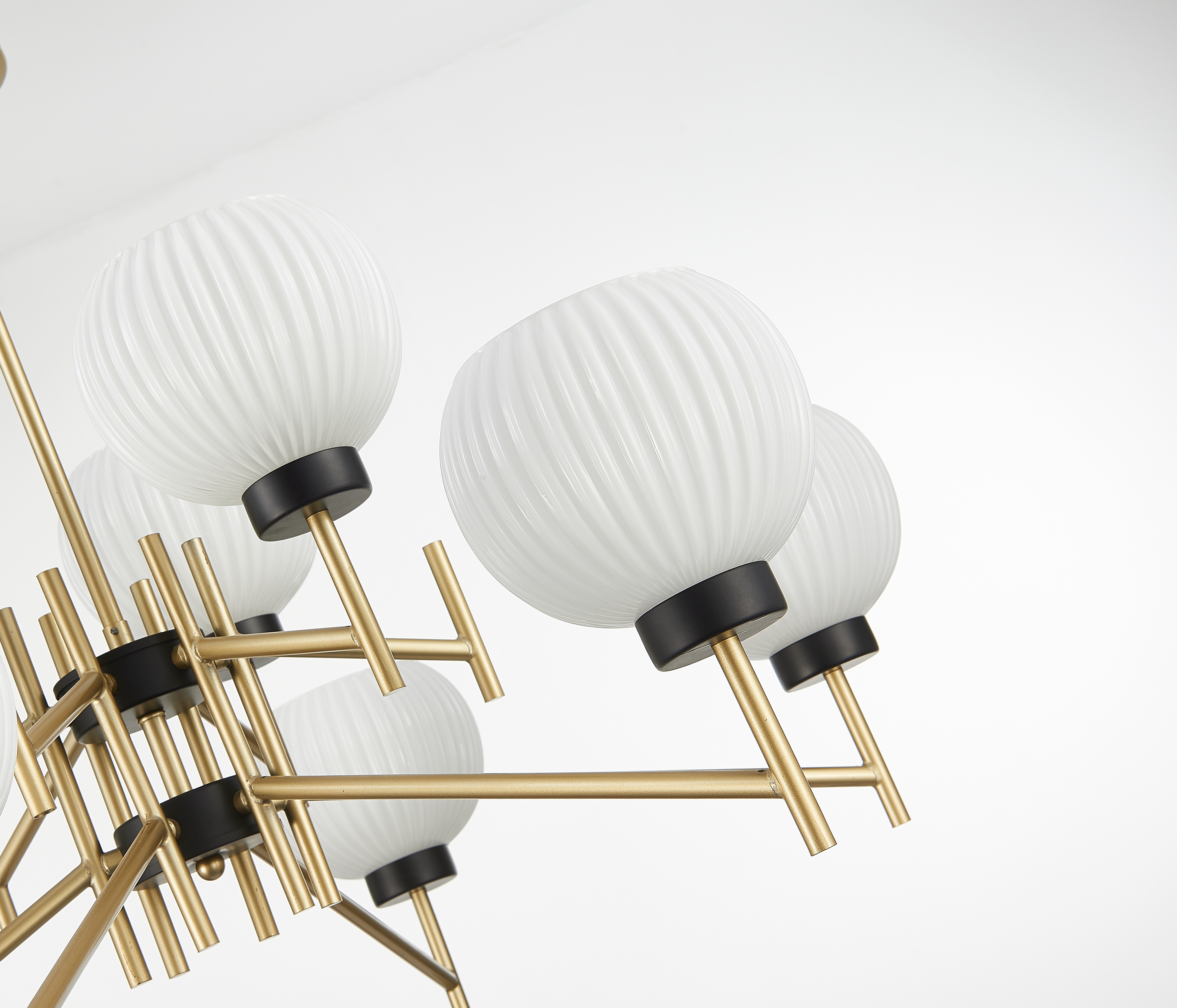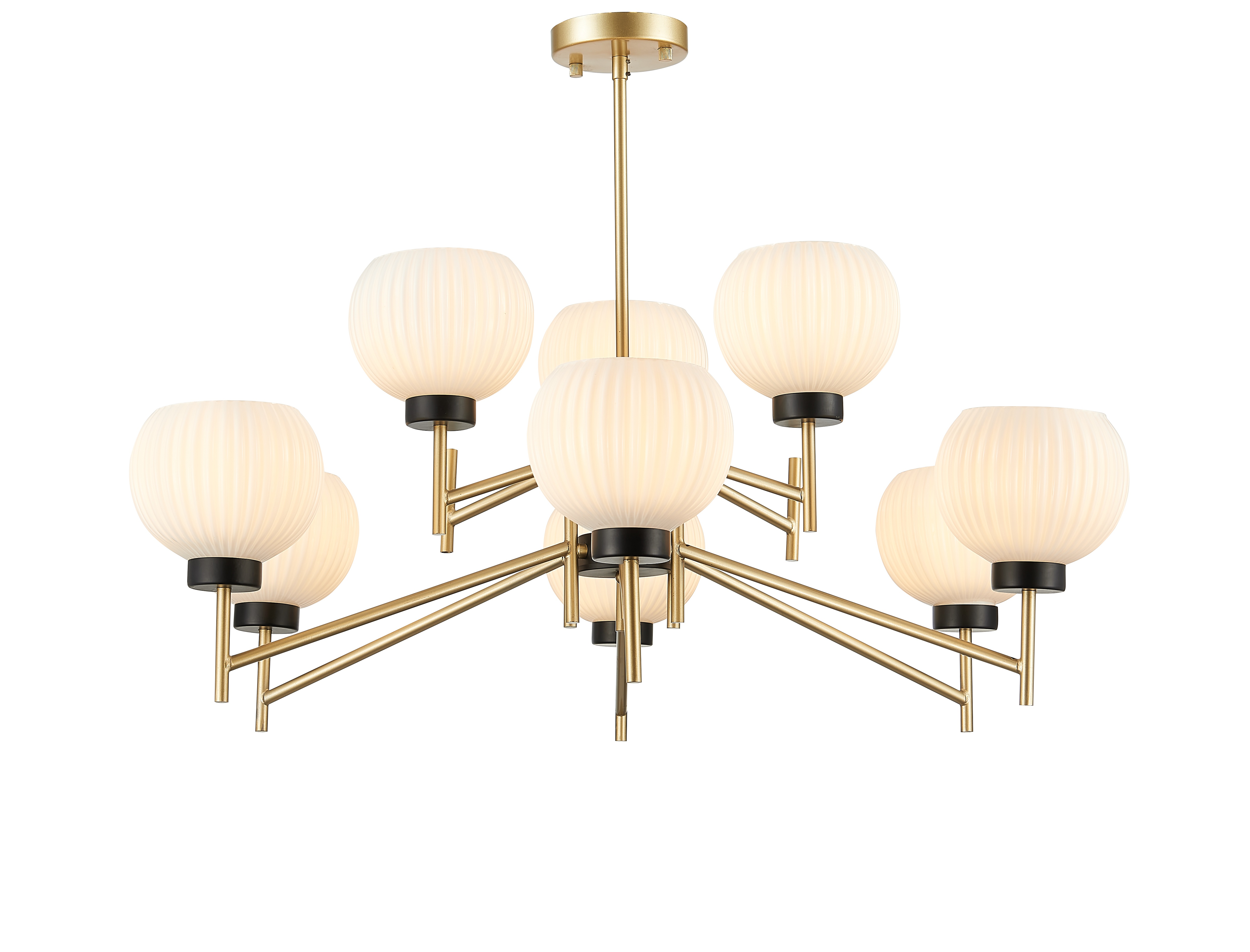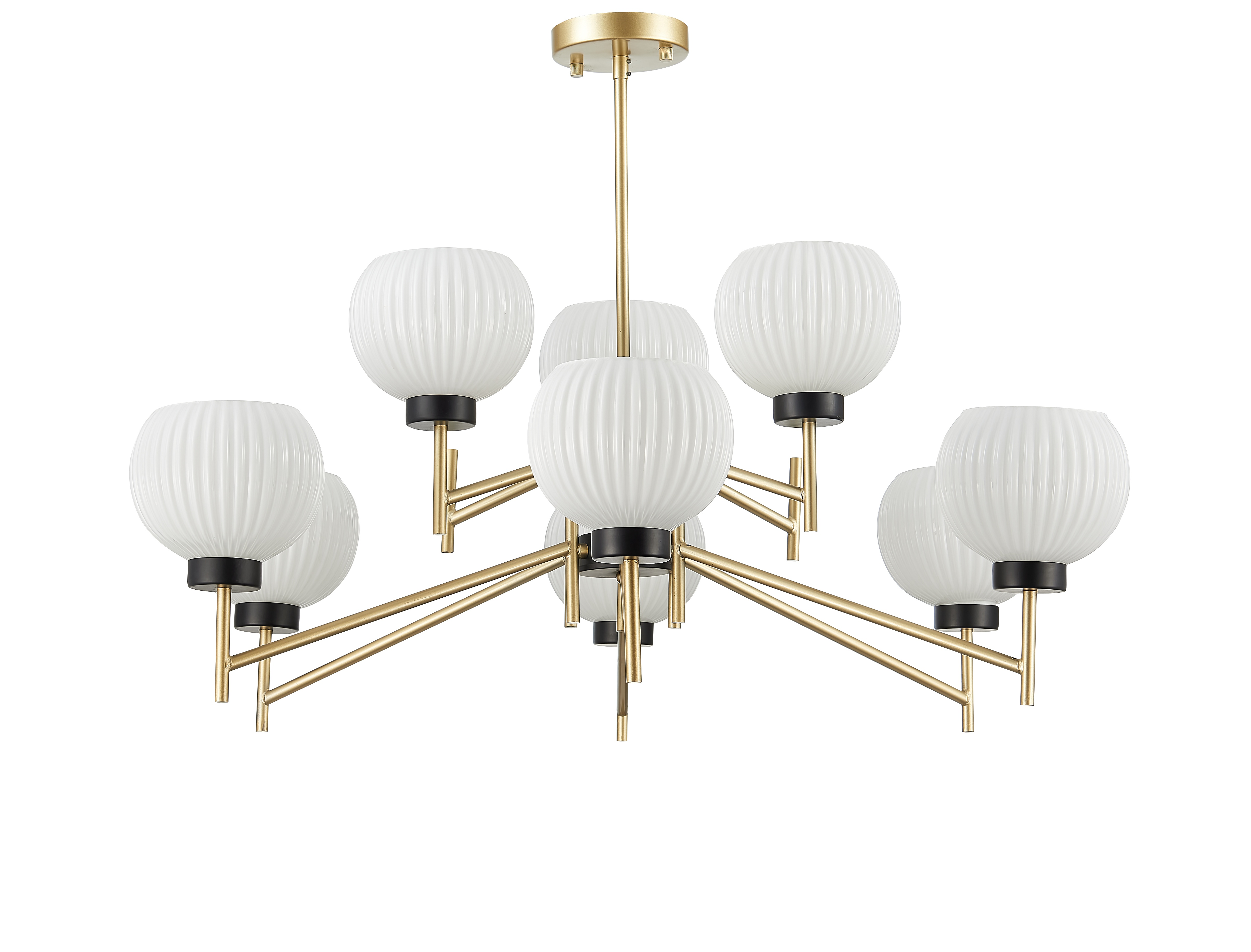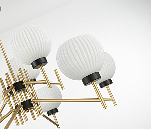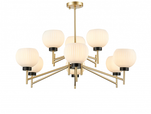 Люстра из металла окрашенного в цвет матового золота с белыми плафонами из рифленого стекла. D880mm, H590-800mm. 9ХЕ27