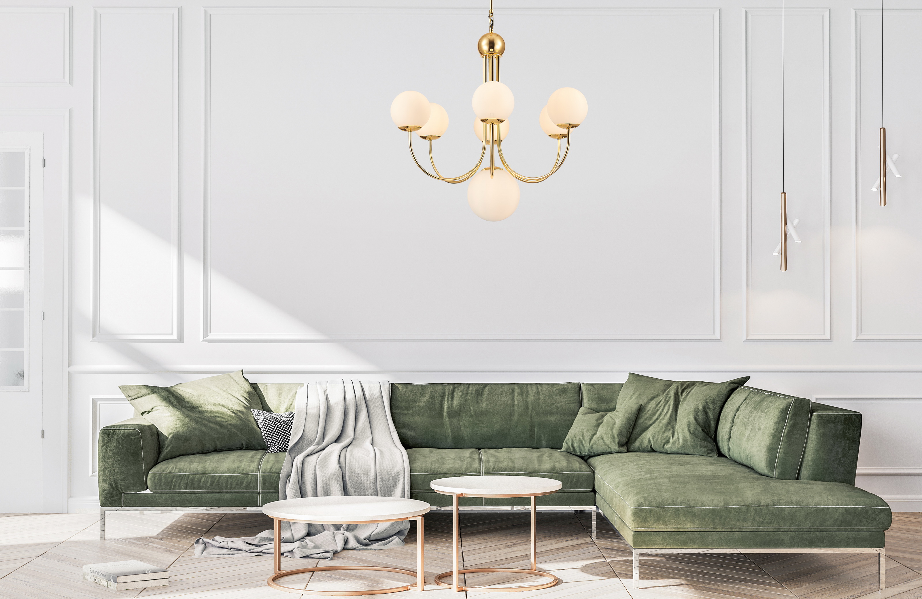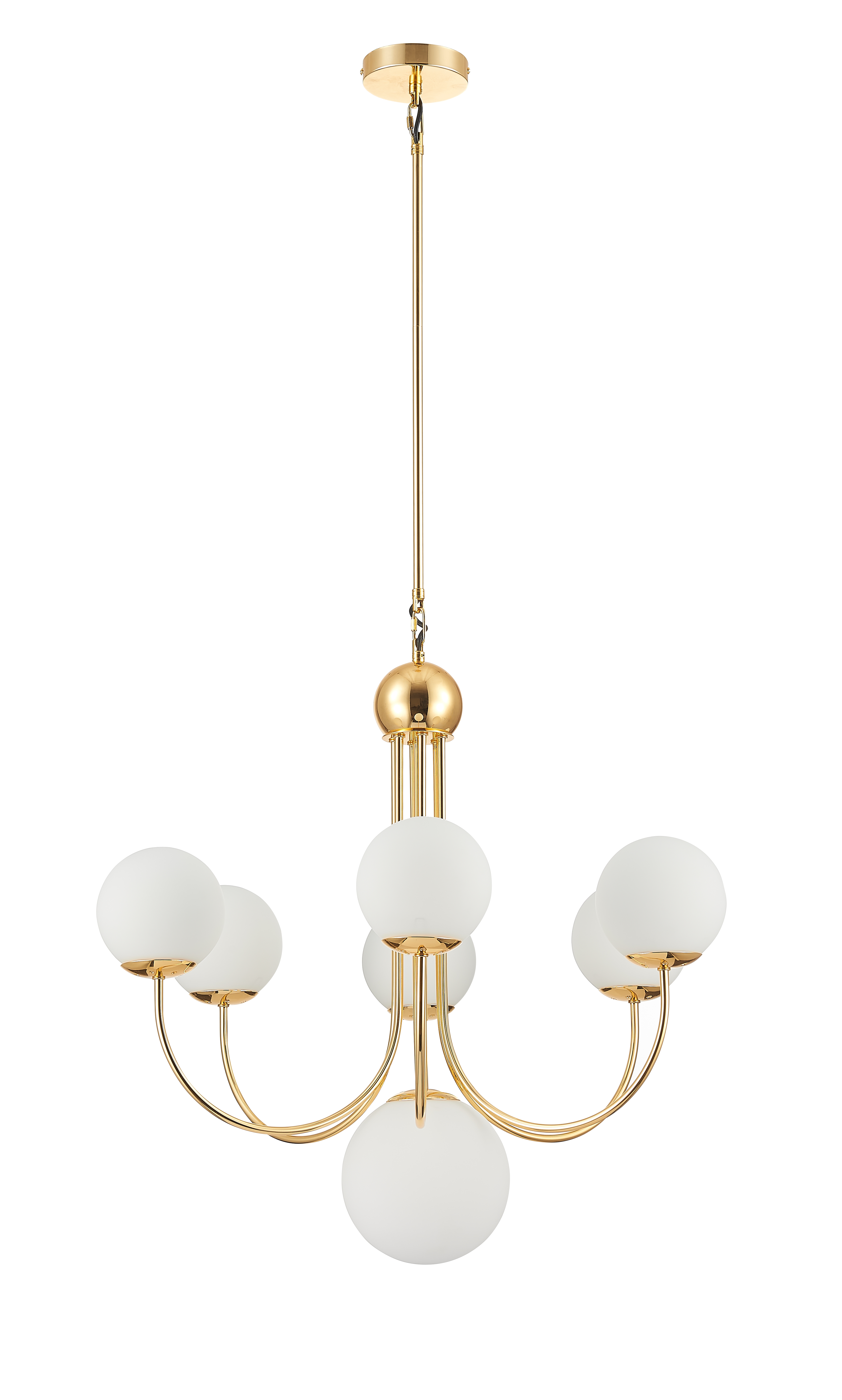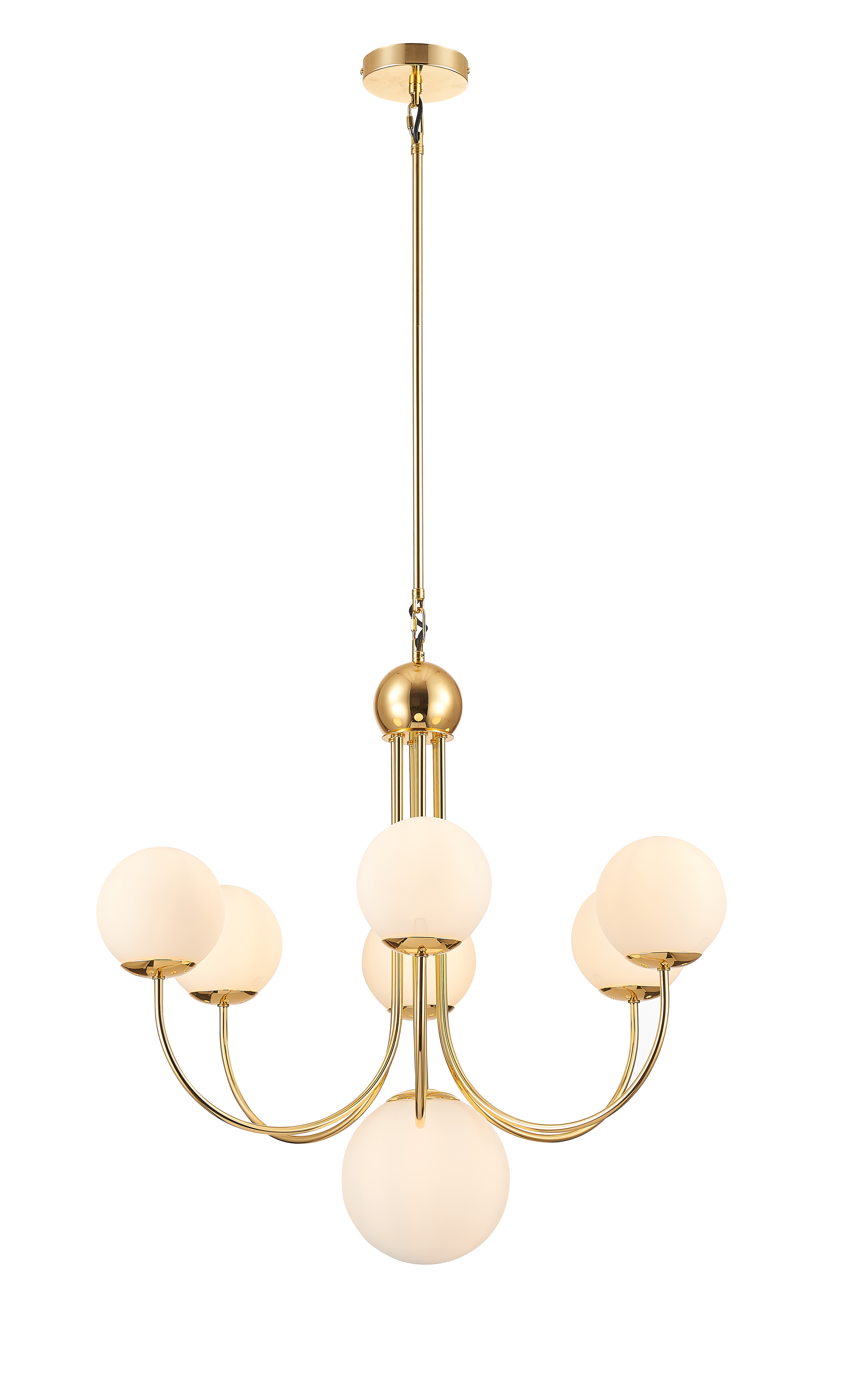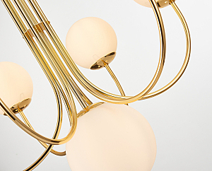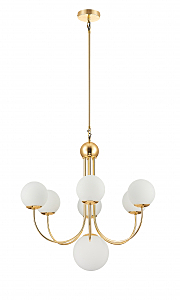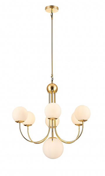 Люстра из металла окрашенного в цвет блестящего золота с белыми плафонами из гладкого стекла. D720mm, H700-1330mm. 7ХЕ14