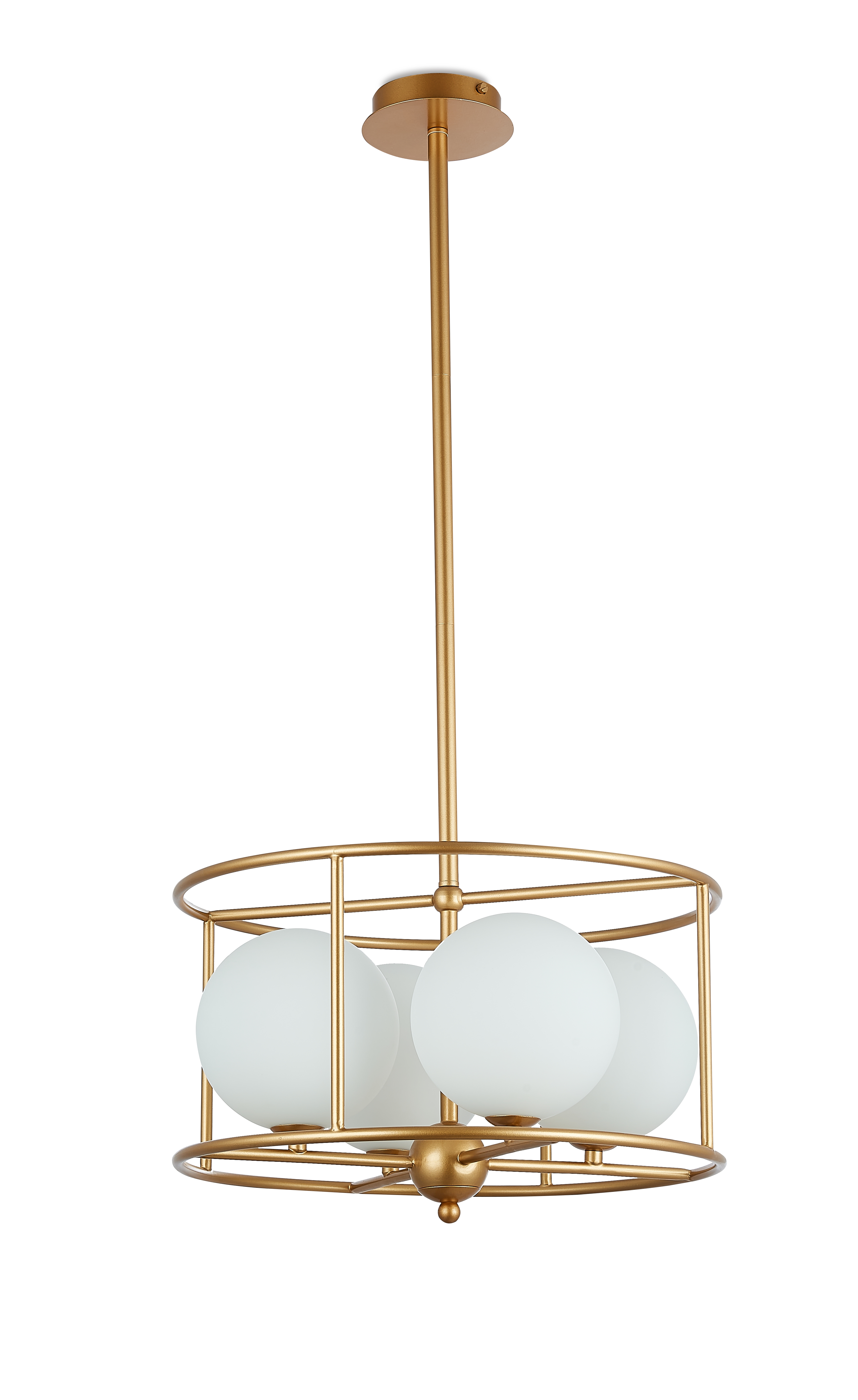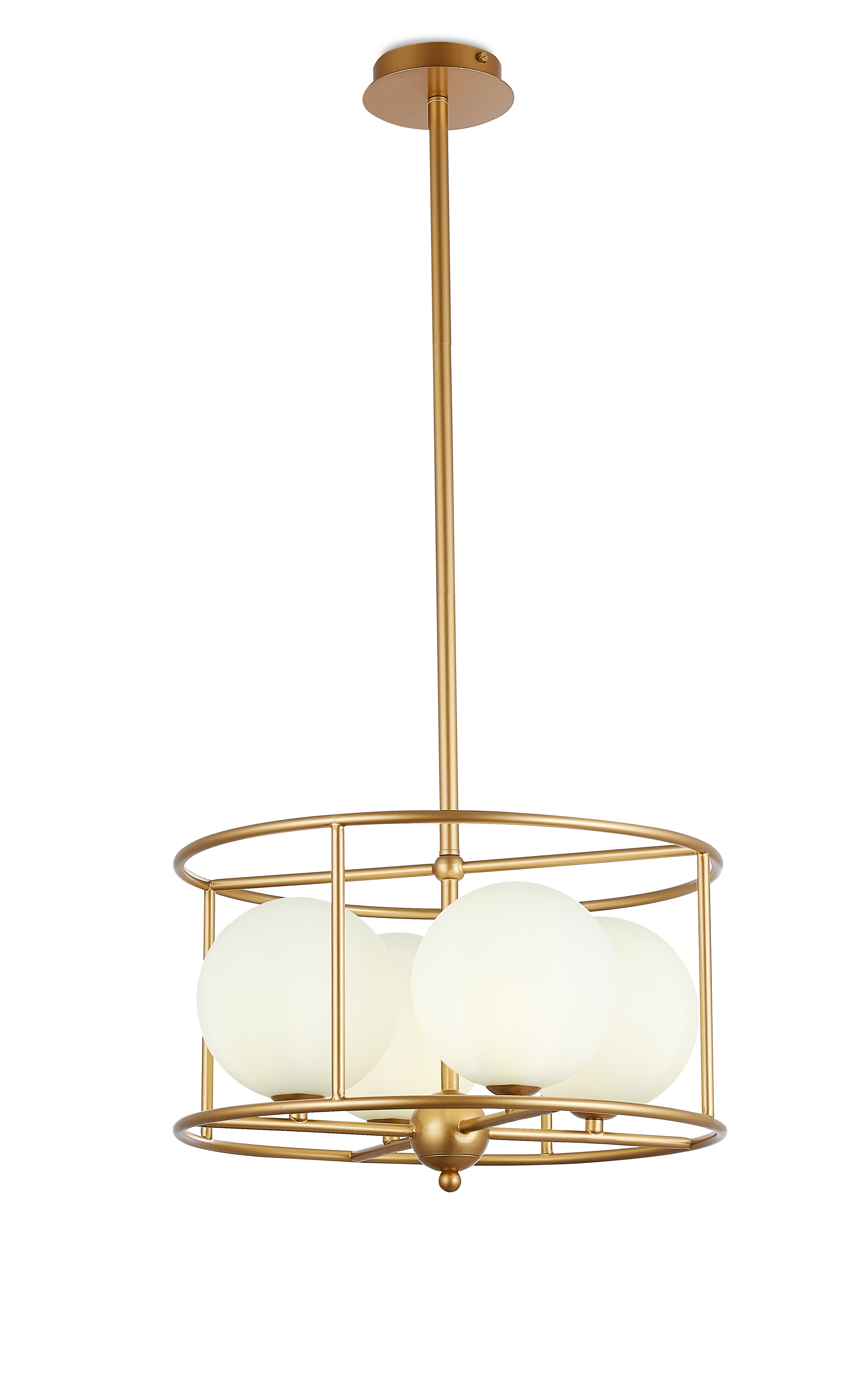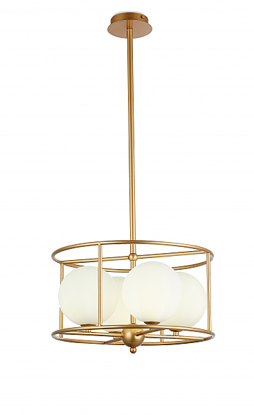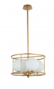 Подвесной светильник из металла цвета матовое золото круглыми плафонами из матового белого стекла внутри. D410mm, H260-185mm. 4ХG9