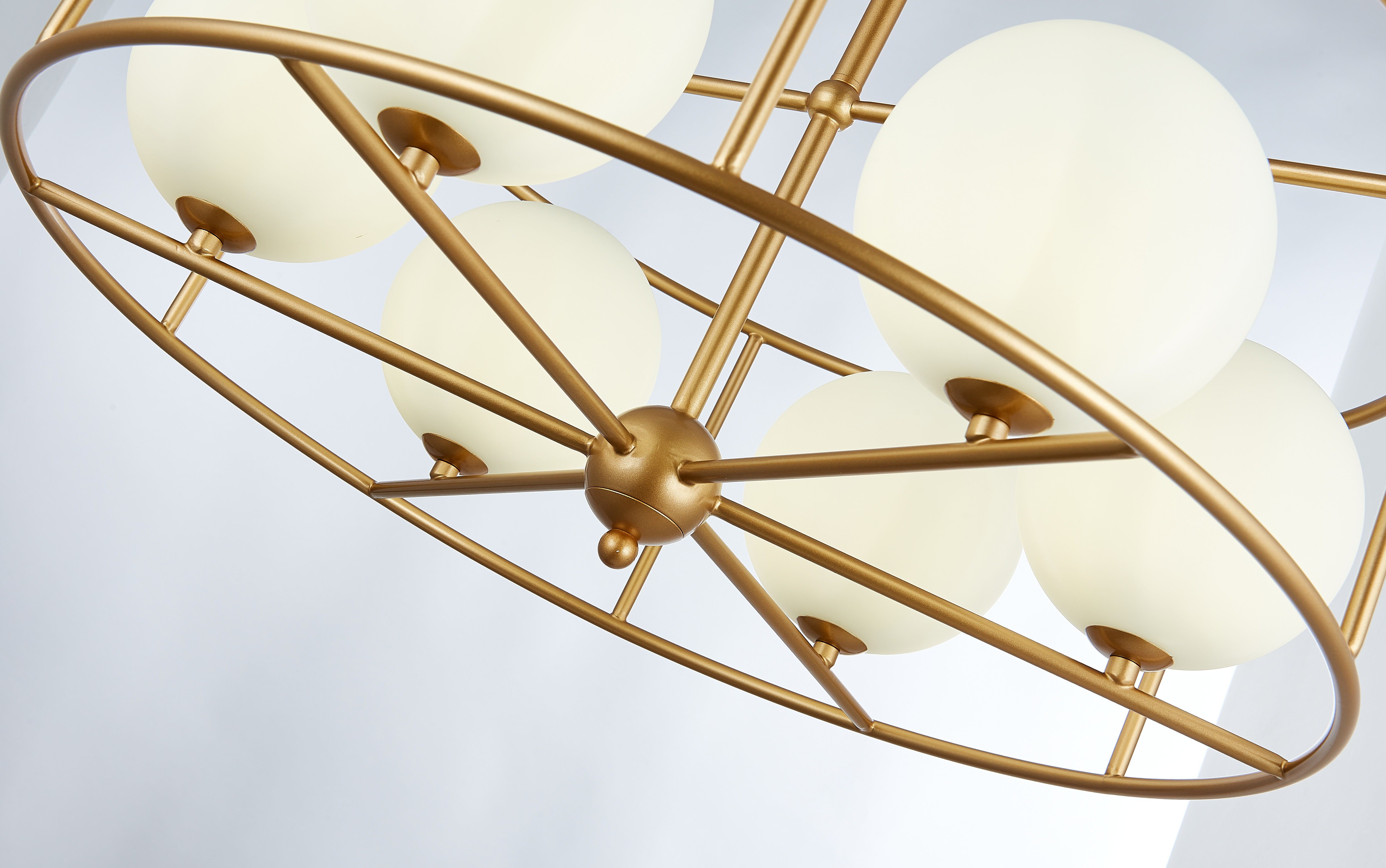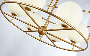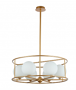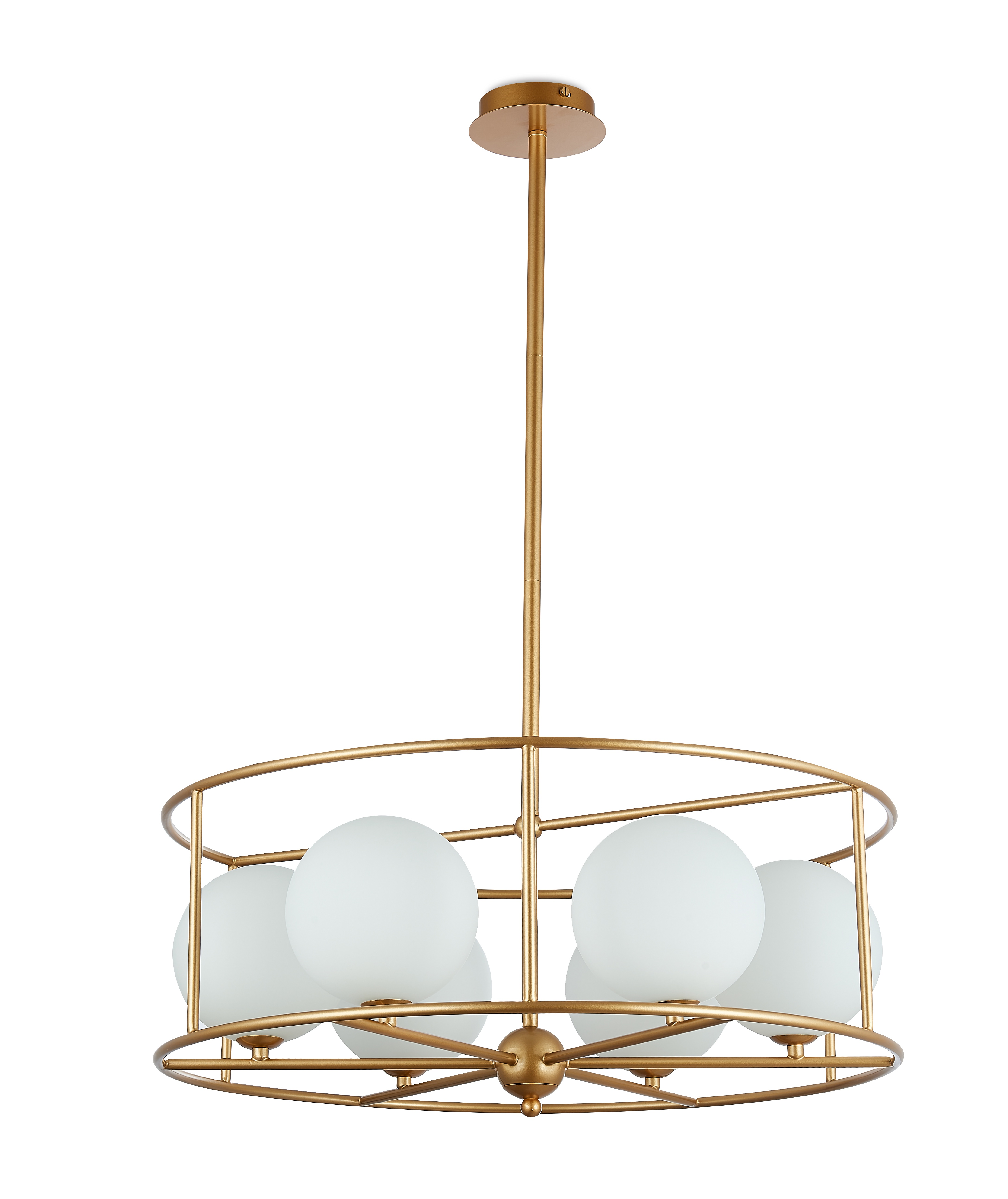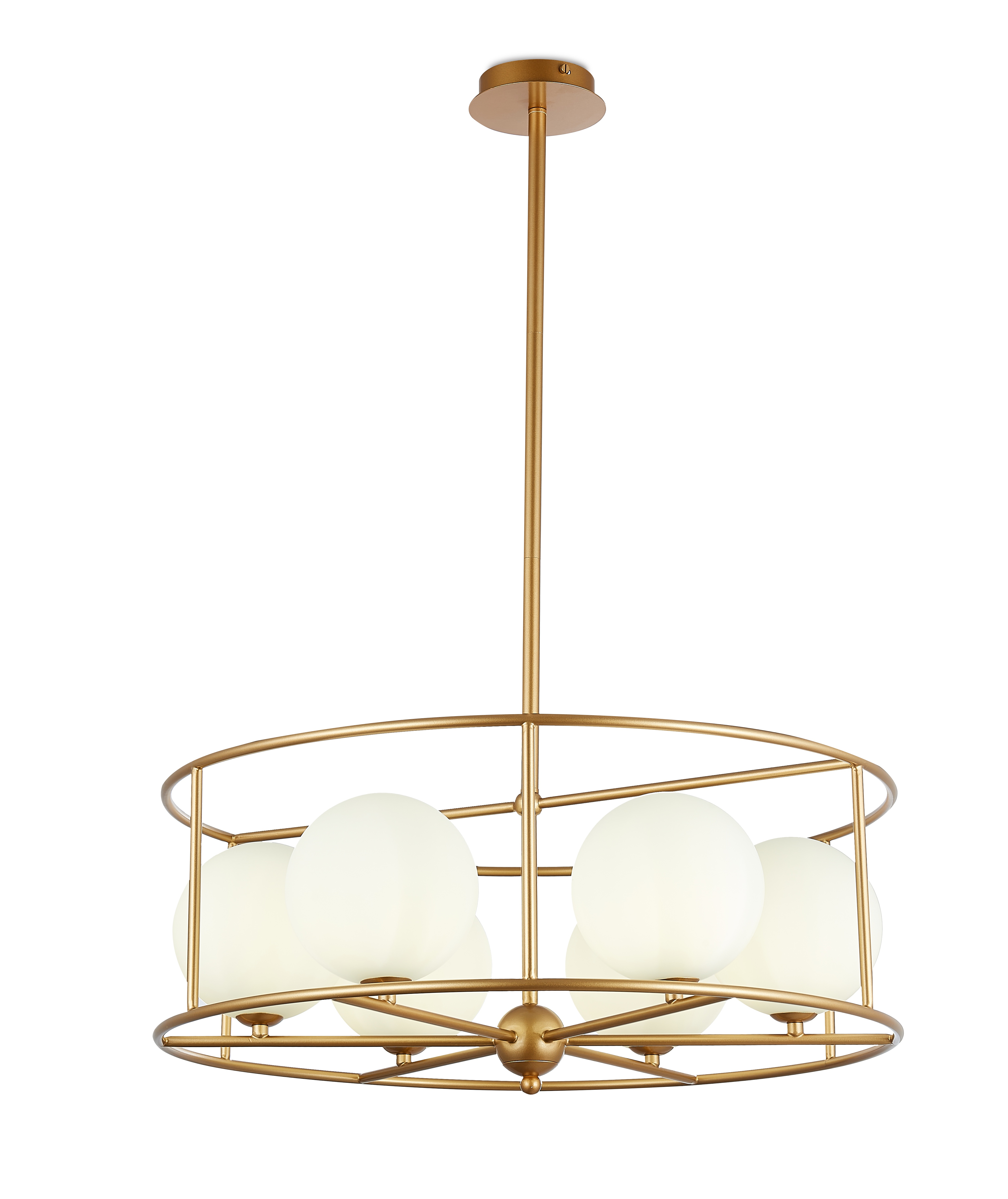 Подвесной светильник из металла цвета матовое золото круглыми плафонами из матового белого стекла внутри. D610mm, H260-185mm. 6ХG9