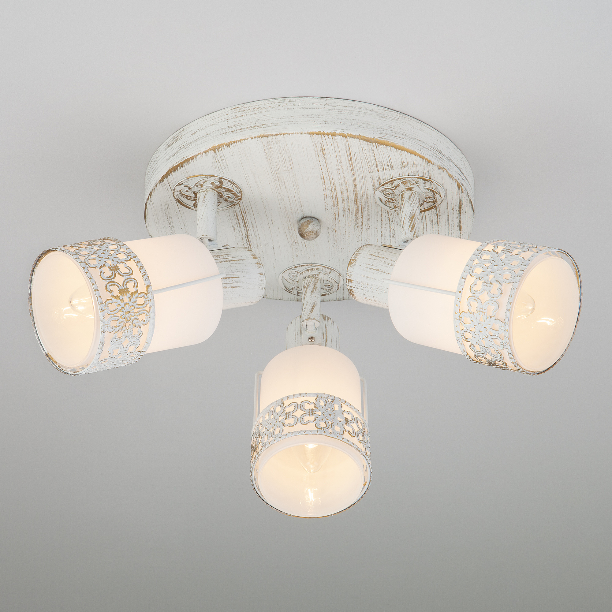 Допускается отличие страны-изготовителя, указанной в характеристиках. Линии производства могут находиться в нескольких государствах. Это не влияет на качество изготовления товара: все заводы данного бренда работают по общим стандартам, а готовые изделия проходят соответствующий контроль.Китай Коллекция Silvia ЦветЦвет арматуры белый с золотом Цвет Белый Материал арматуры Металл Цвет плафона Белый Материал декора Металл Материал плафона Стекло РазмерыВысота (мм) 160 Длина (мм) 220 Ширина (мм) 220 ЭлектрикаКоличество ламп (шт) 3 Цоколь E14 Лампочки в комплекте Нет в комплекте Мощность лампы (Вт) 40 Напряжение (В) 220 Дополнительная информацияТехническая оссобеность Поворотный -