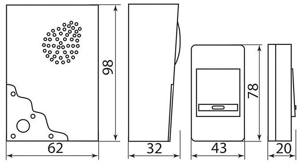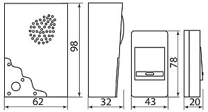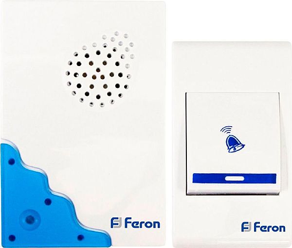 Звонок электрический дверной беспроводной FERON E-223, 32 мелодии, дальность действия 100м, цвет белый/синий, регулировка громкости - нет, шифрование сигнала - нет БАЗА: 2*1,5V/AA, 98*62*32 мм, КНОПКА: IP20, 12V 23A*1 (в комплекте) , раб.t -10...+40 ?С, размер кнопки 80*50*20мм