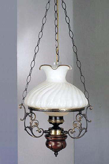 Большой одно-рожковый подвес. Совмещены классический стиль и «модерн» конца XIX века. Украсит интерьер загородного дома или дачи в классическом стиле. Благородная, изящная серия. Корпус светильника состит из металла с покрытием BRONZO SF и ценных пород дерева. Плафоны - VETRO BLANCO.