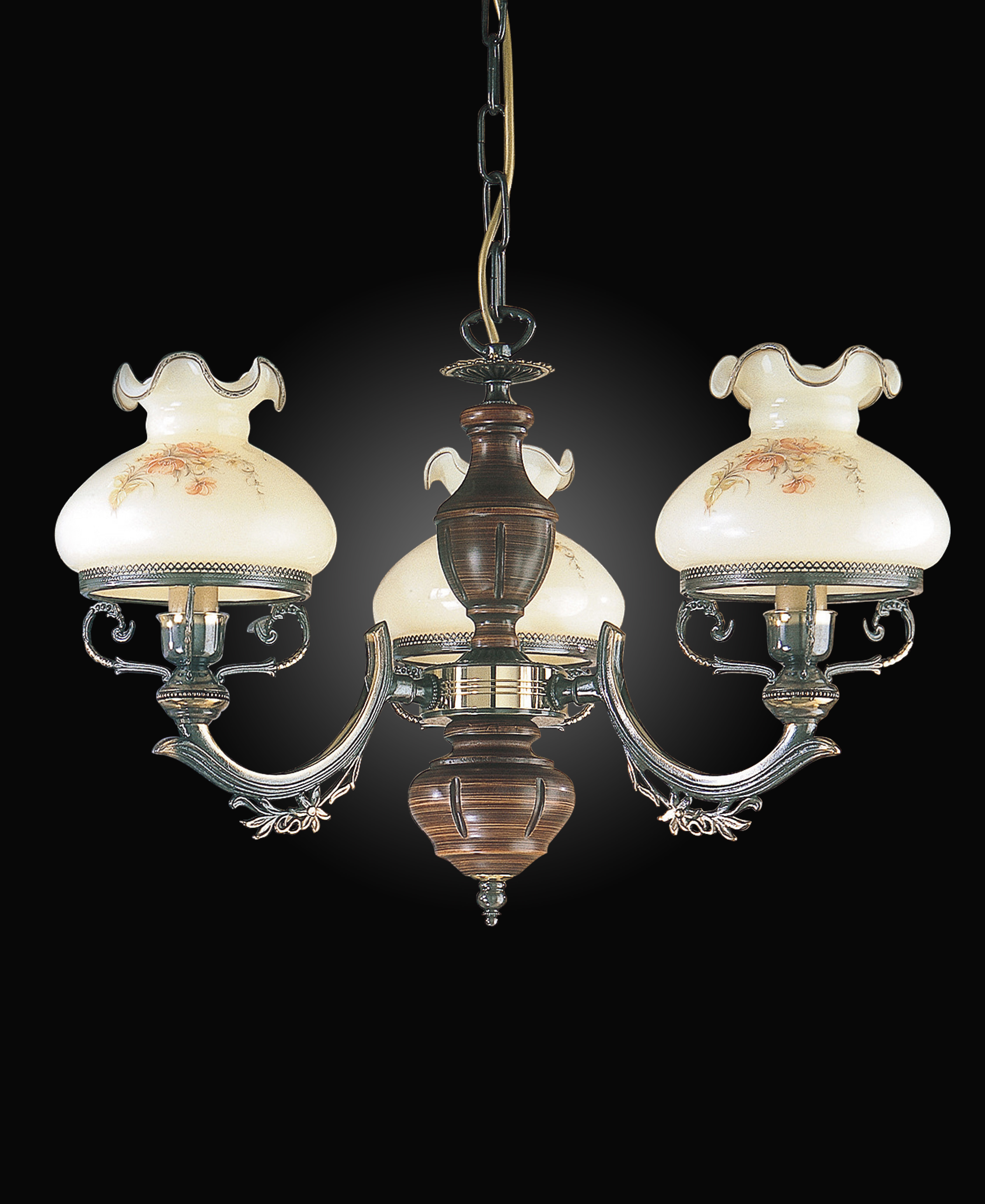 Трёх-рожковая классическая люстра. Совмещены классический стиль и «модерн» конца XIX века. Украсит интерьер загородного дома или дачи в классическом стиле. Благородная, изящная серия. Корпус люстры состоит из металла с покрытием BRONZO SF и ценных пород дерева. Плафоны - VETRO AV. DEC. .