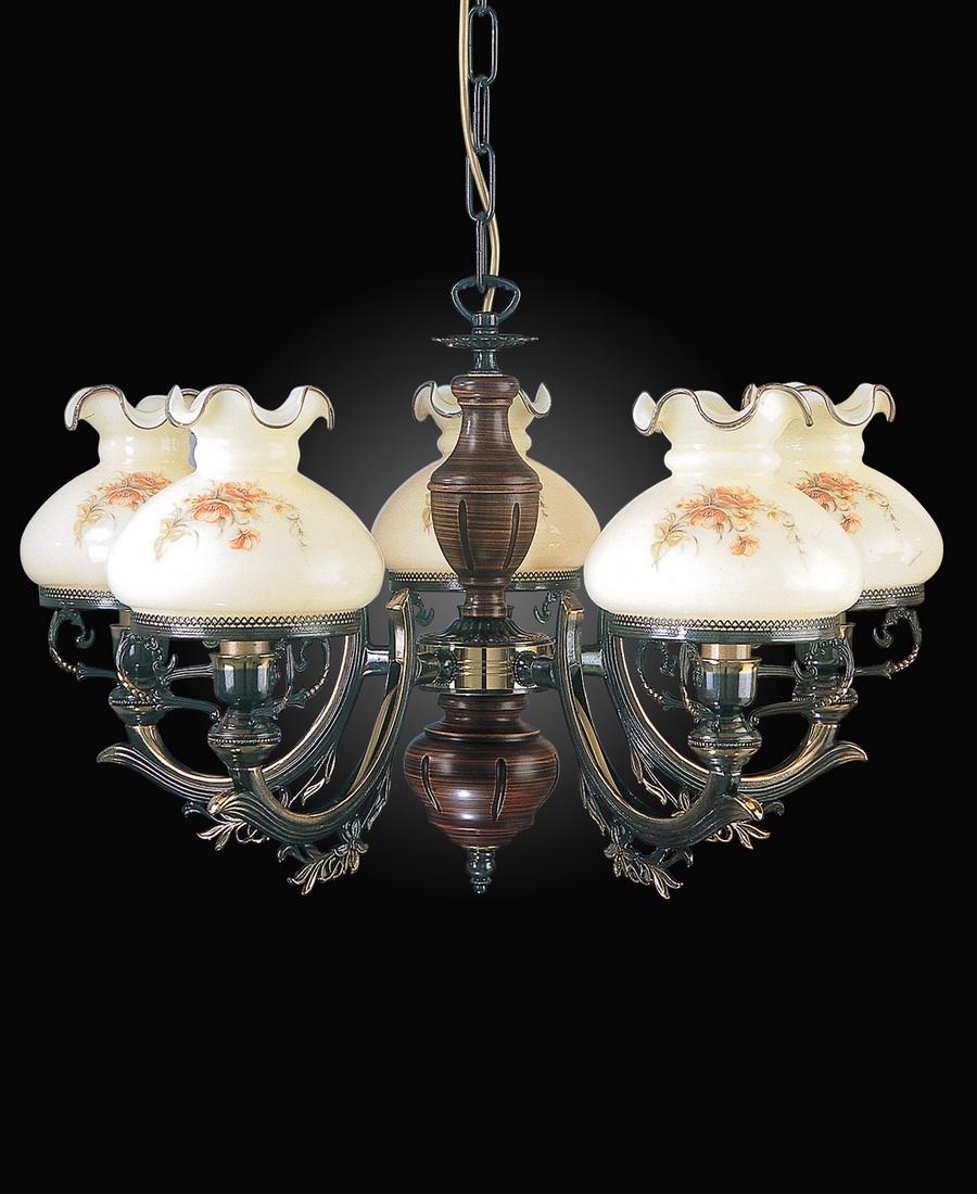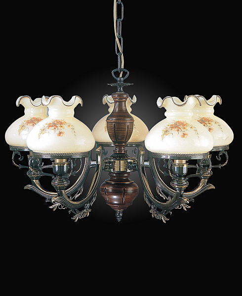 Пяти-рожковая классическая люстра. Совмещены классический стиль и «модерн» конца XIX века. Украсит интерьер загородного дома или дачи в классическом стиле. Благородная, изящная серия. Корпус люстры состоит из металла с покрытием BRONZO SF и ценных пород дерева. Плафоны - Плафоны - VETRO AV. DEC.