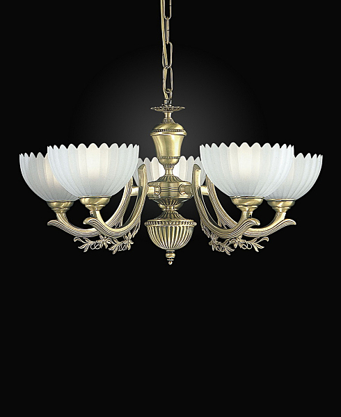 Пяти-рожковая классическая люстра. Украсит интерьер в классическом стиле. Благородная, изящная серия. Корпус люстры состит из металла с покрытием BRONZO ARTE. Плафоны - VETRO SATIN.