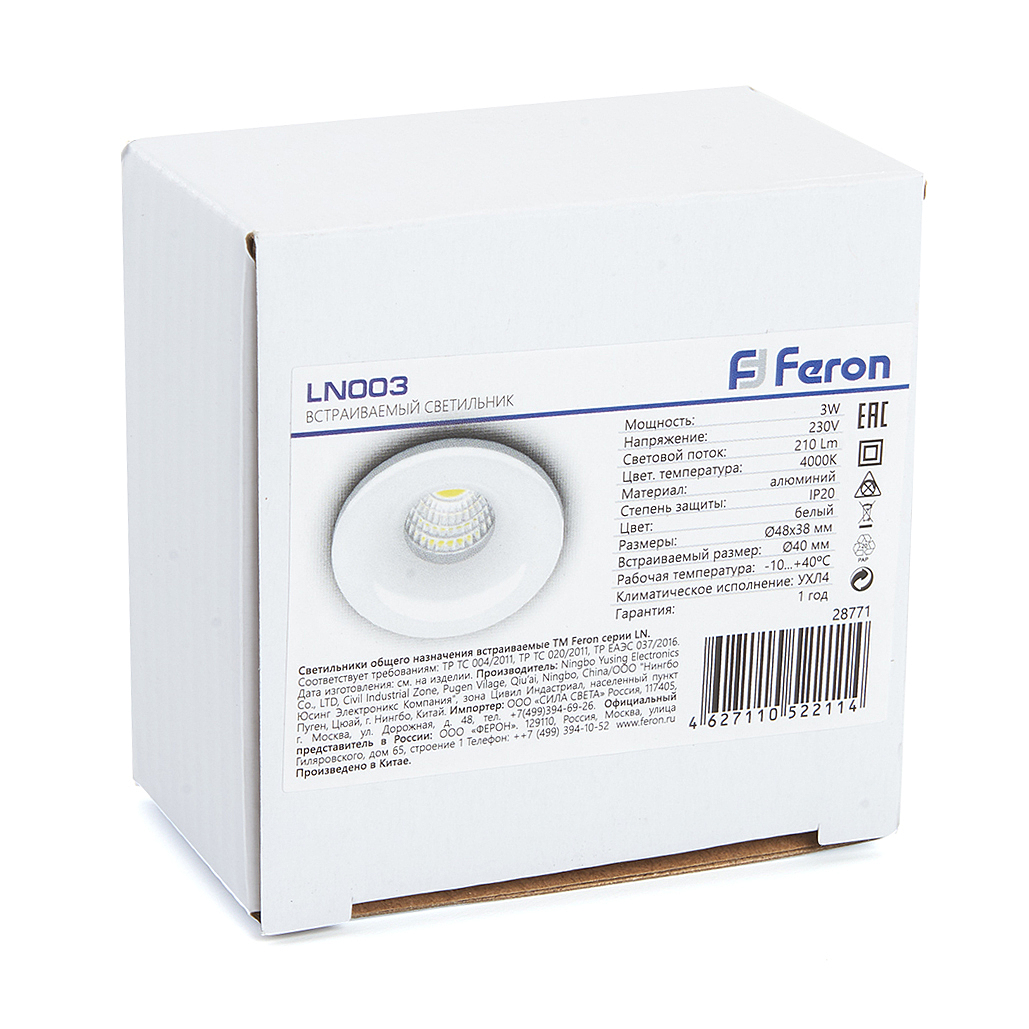Допускается отличие страны-изготовителя, указанной в характеристиках. Линии производства могут находиться в нескольких государствах. Это не влияет на качество изготовления товара: все заводы данного бренда работают по общим стандартам, а готовые изделия проходят соответствующий контроль.Китай Коллекция LN003 ЦветЦвет арматуры Белый Цвет Белый Материал арматуры Алюминий Материал плафона Акриловый полимер РазмерыВысота (мм) 38 Диаметр (мм) 48 Ширина (мм) 48 Диаметр врезного отверстия (мм) 40 ЭлектрикаКоличество ламп (шт) 1 Цоколь LED Мощность лампы (Вт) 3W Напряжение (В) 220 Световой поток 210 Цветовая температура нейтральный (4000k) Дополнительная информацияСтепень защиты (IP) IP20 Техническая оссобеность Полностью светодиодная -