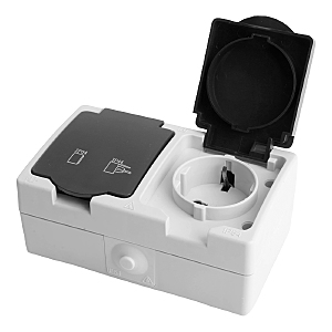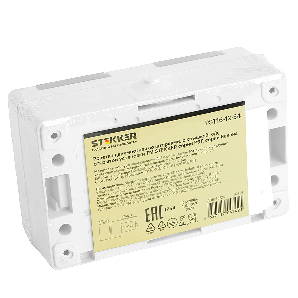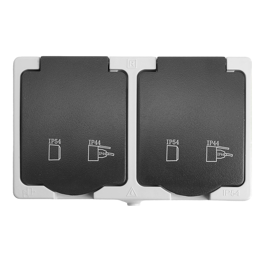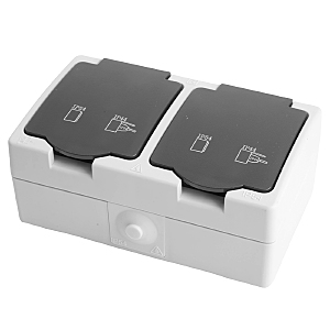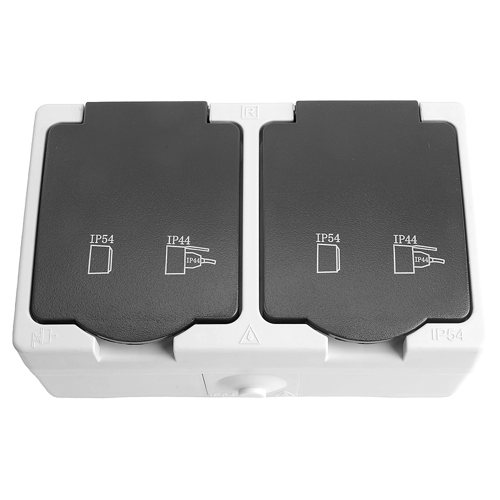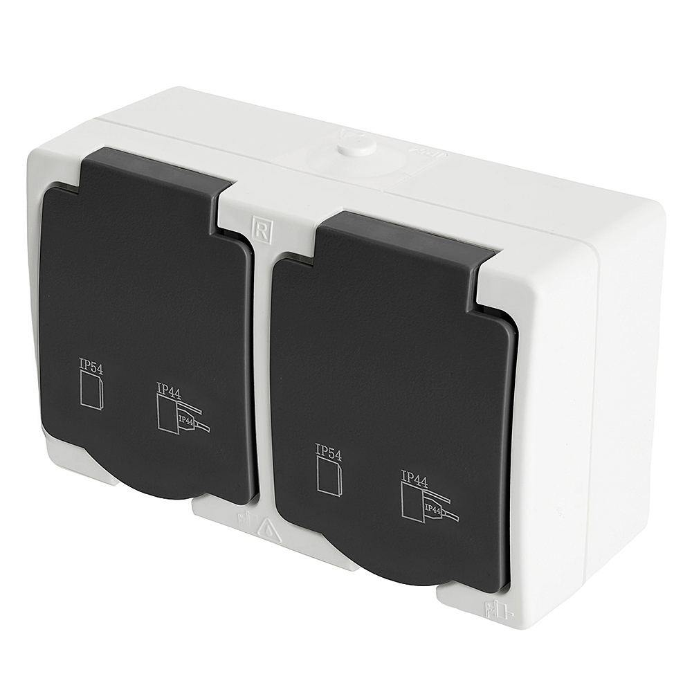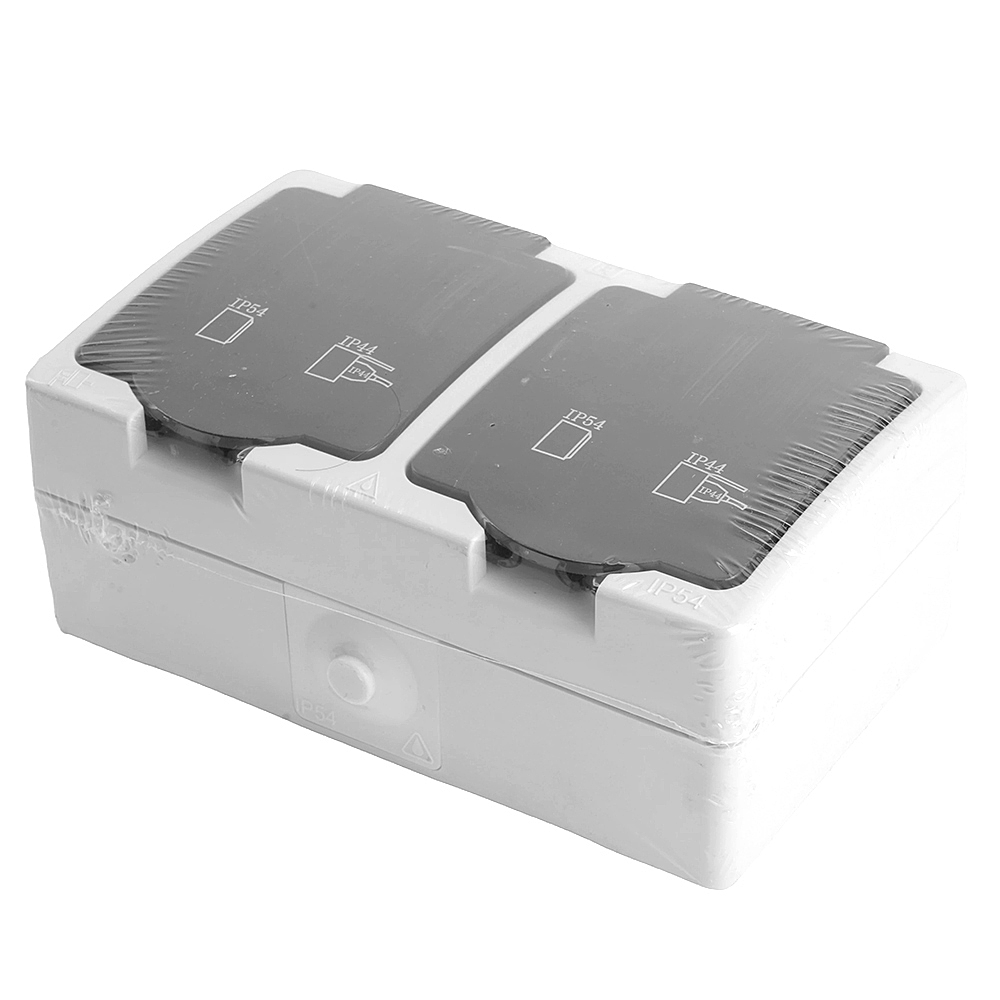 Розетка STEKKER PST16-12-54 (расстояние между монтажн. отвер-ми: по гориз. - 113мм, по вертик.- 65мм) на 2 гнездо, с крышкой, с заземлением. Материал: ABS пластик, цвет серый-графит, размер 80*130*55мм. Номинальное напряжение , номинальный ток 16А, диапазон рабочих температур 0..+35градусовC, IP54