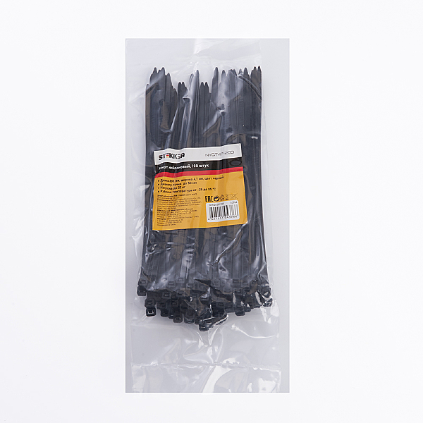 Хомут электромонтажный STEKKER NYCT47-200, одноразовый, черный, материал - нейлон , размер 4,7*200мм, максимальный диаметр пучка - 50мм, нагрузка - 22кг, диапазон рабочих температур -25?C - +85?C, рекомендуемая температура хранениня -2...+25С