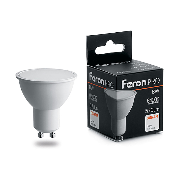 Лампа светодиодная FERON LB-1608, MR16 (рефлекторная), 8W 230V GU10 6400К (дневной), рассеиватель матовый белый, 570Lm, угол рассеивания 120?, 57*50мм